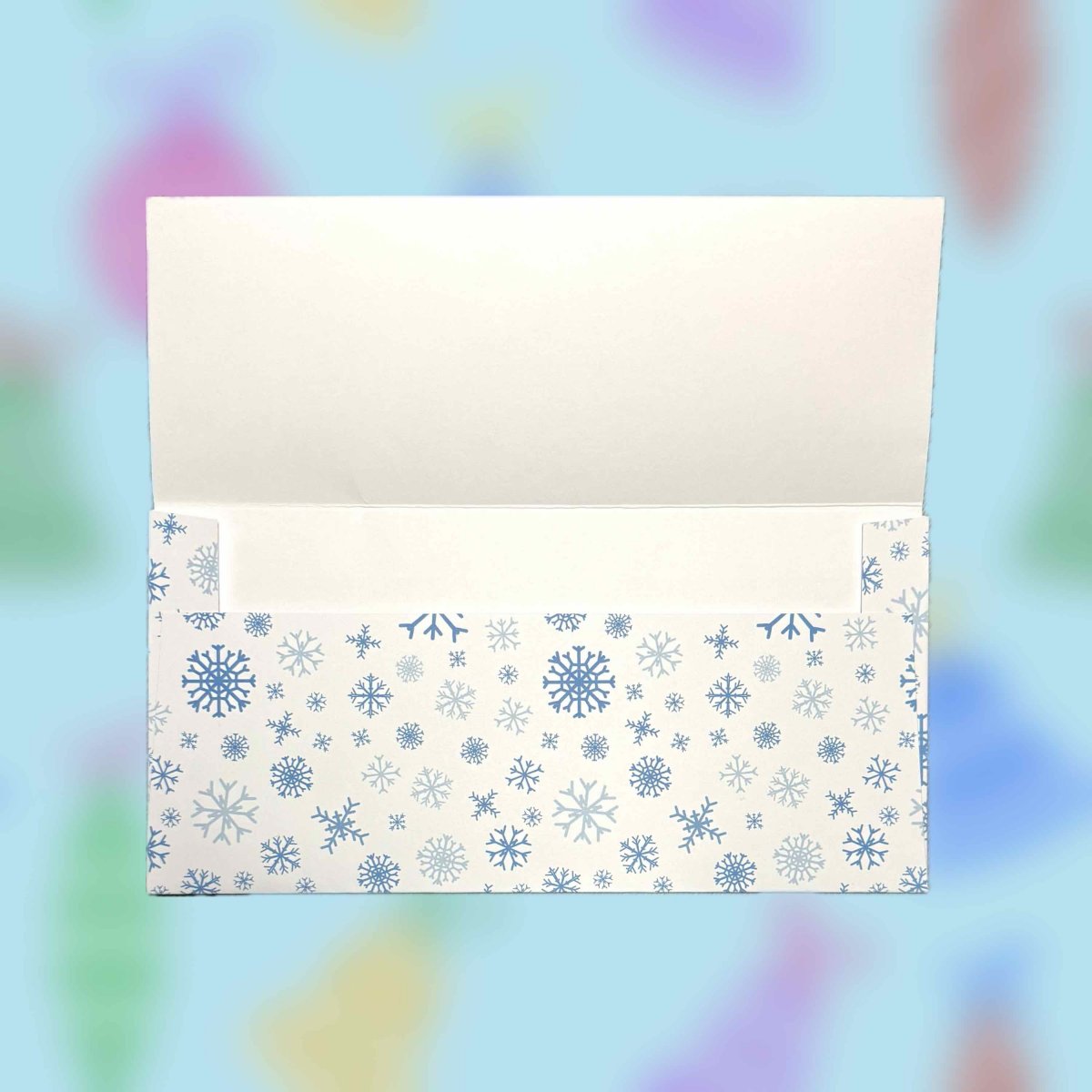 Papírová darovací ručně skládaná obálka s potiskem autorskou grafikou se sněhovými vločkami na bílém pozadí. Drobný vzor. Obálka z bílého papíru gramáže 160 g/m2 s inkoustovým potiskem.