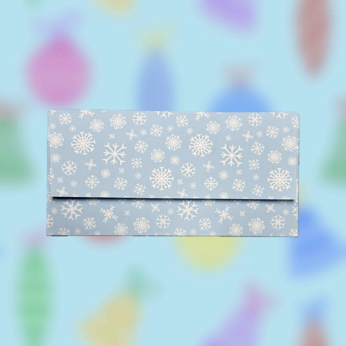 Papírová darovací ručně skládaná obálka s potiskem autorskou grafikou s bílými sněhovými vločkami na světle modrém pozadí. Drobný vzor. Obálka z bílého papíru gramáže 160 g/m2 s inkoustovým potiskem.