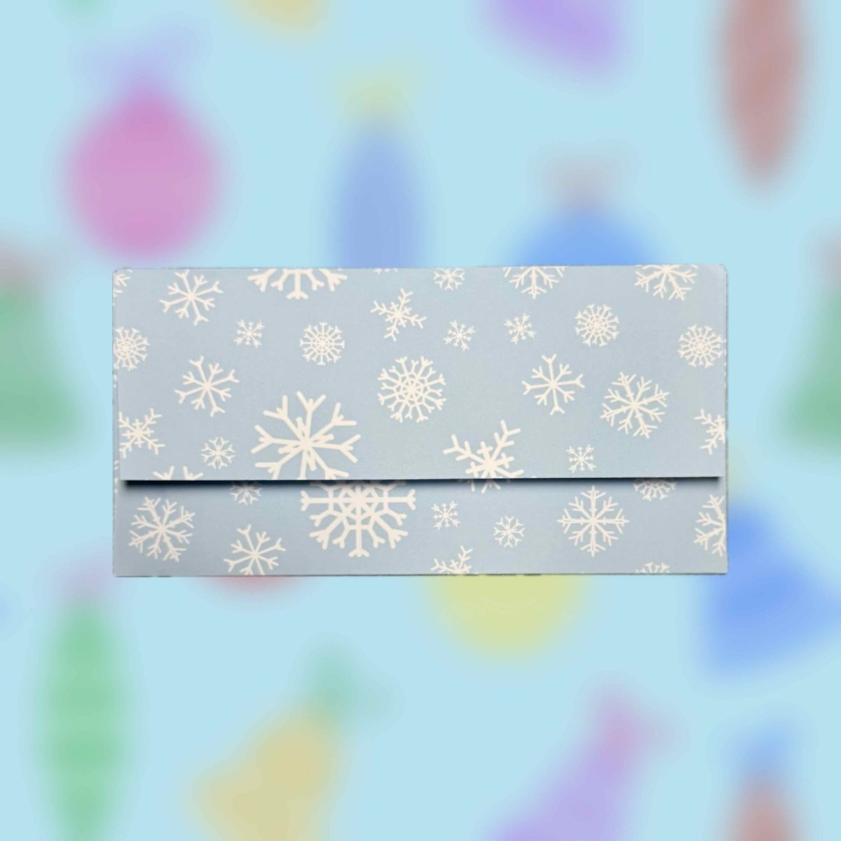 Papírová darovací ručně skládaná obálka s potiskem autorskou grafikou s bílými sněhovými vločkami na světle modrém pozadí. Velký vzor. Obálka z bílého papíru gramáže 160 g/m2 s inkoustovým potiskem.