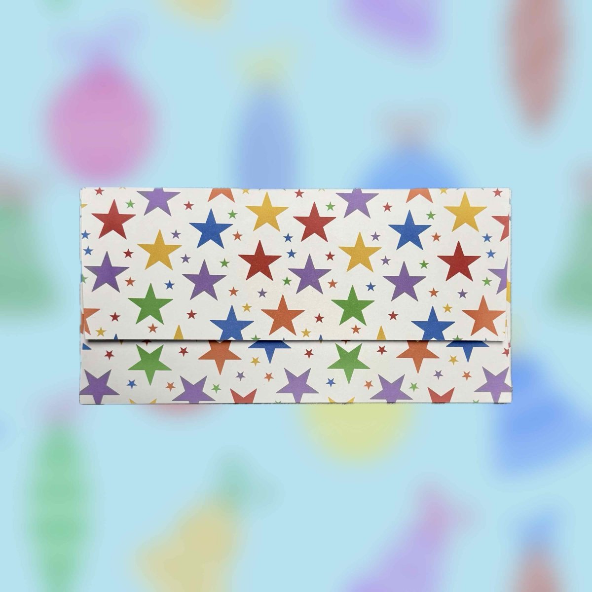 Papírová darovací ručně skládaná obálka s potiskem autorskou grafikou s barevnými velkými hvězdičkami na bílém pozadí. Obálka z bílého papíru gramáže 160 g/m2 s inkoustovým potiskem.