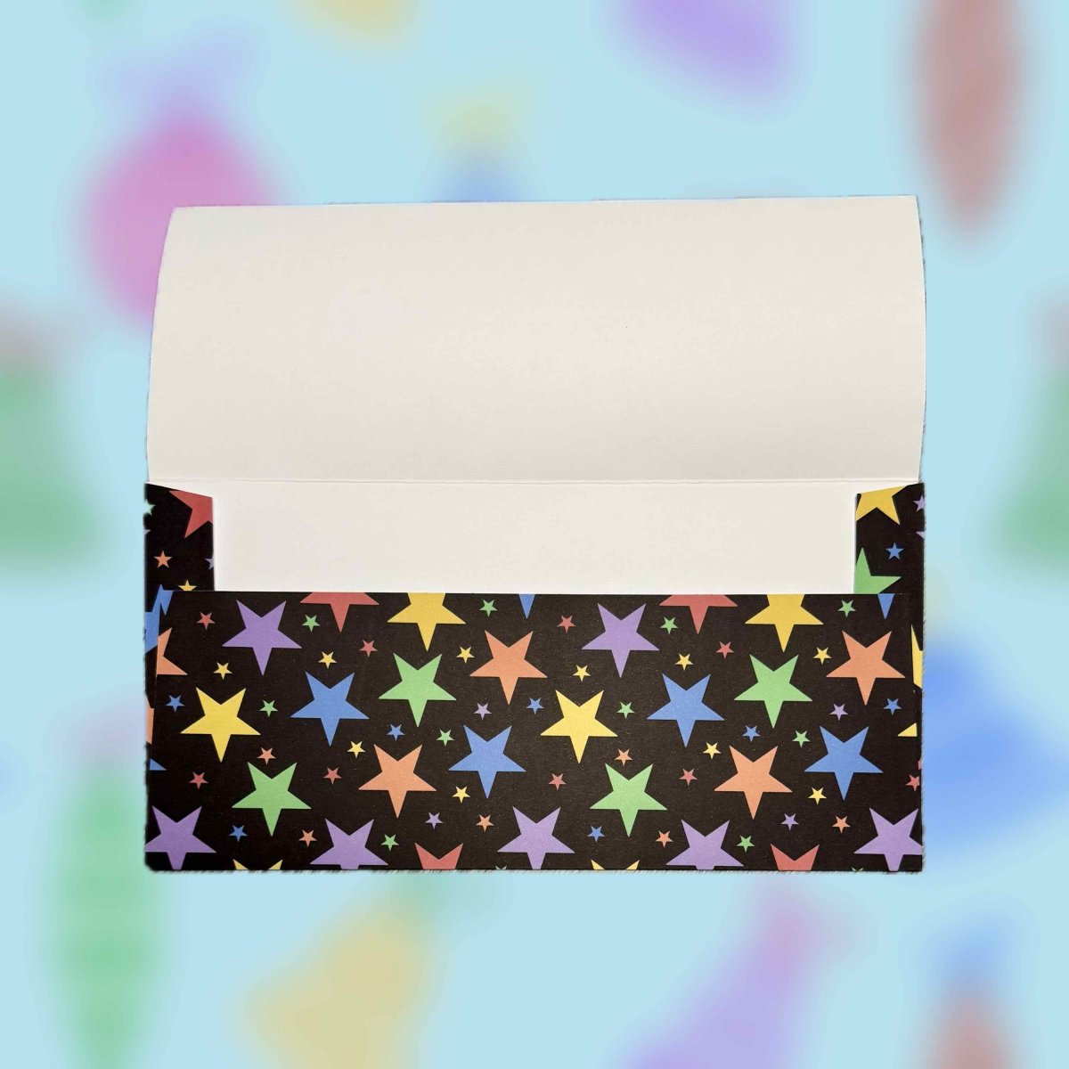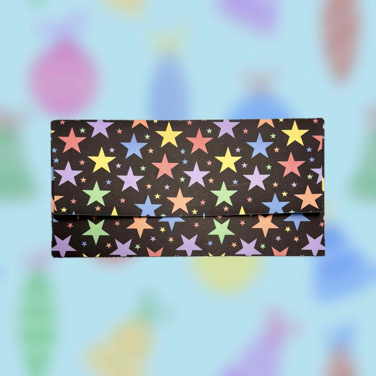 Papírová darovací ručně skládaná obálka s potiskem autorskou grafikou s barevnými velkými hvězdičkami na antracitovém pozadí. Obálka z bílého papíru gramáže 160 g/m2 s inkoustovým potiskem.