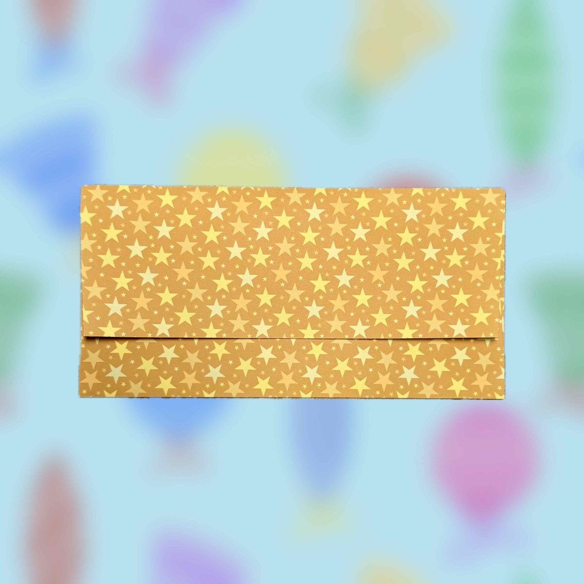 Papírová darovací ručně skládaná obálka s potiskem autorskou grafikou se žlutými a zlatými drobnými hvězdičkami na zlatém pozadí. Obálka z bílého papíru gramáže 160 g/m2 s inkoustovým potiskem.