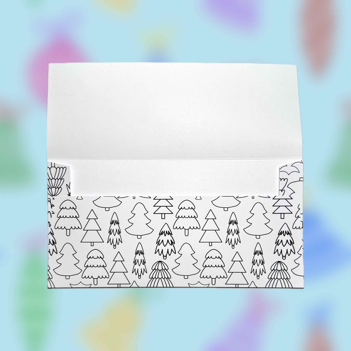 Papírová darovací ručně skládaná obálka s potiskem autorskou grafikou s černobílými obrysovými různě tvarovanými stromky ve stylu omalovánek. Obálka z bílého papíru gramáže 160 g/m2 s inkoustovým potiskem.
