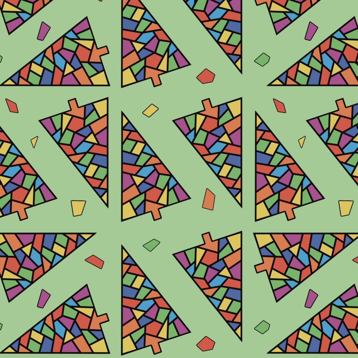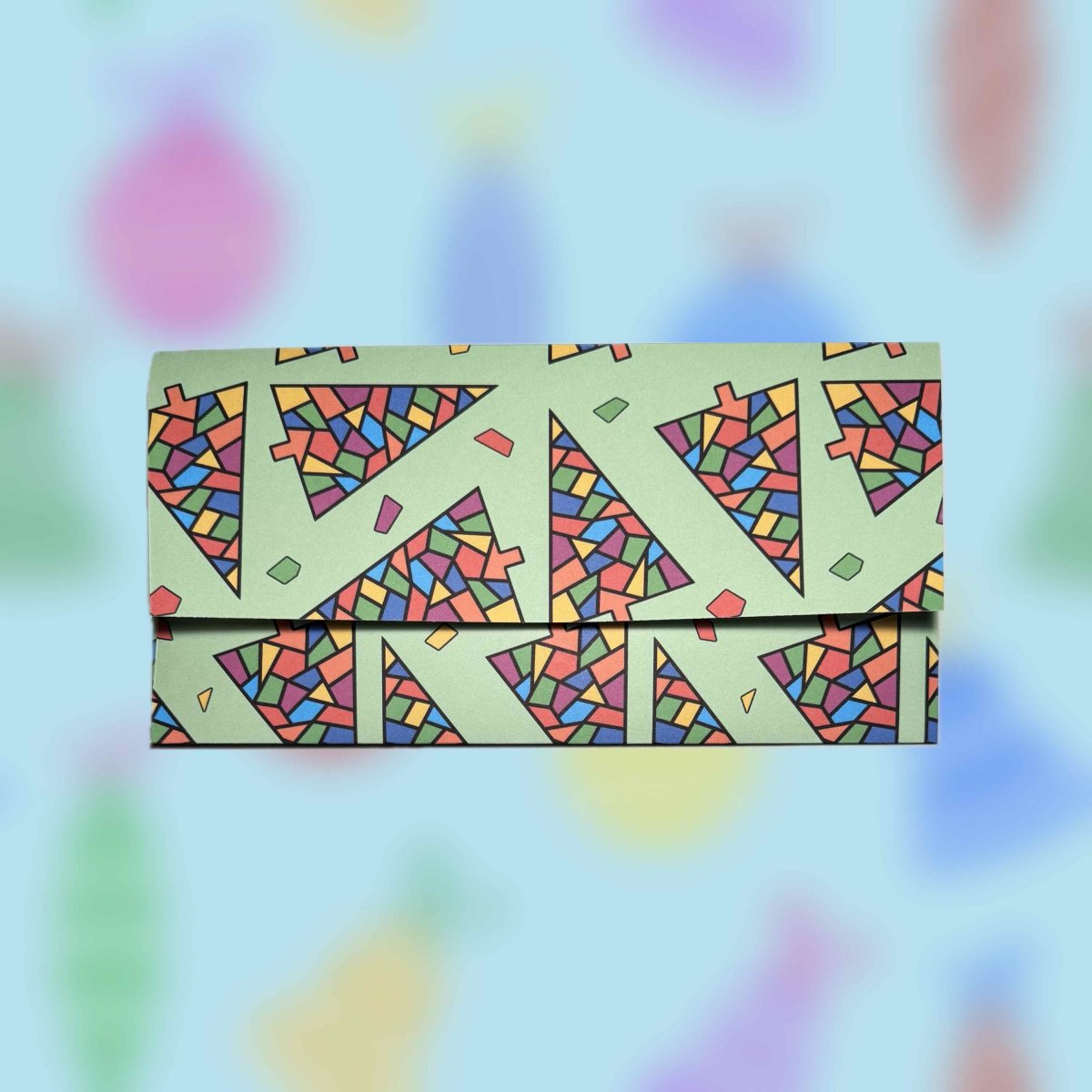 Papírová darovací ručně skládaná obálka s potiskem autorskou grafikou s motivem vitrážových trojúhelníkových vánočních stromků na hráškově zeleném pozadí. Obálka z bílého papíru gramáže 160 g/m2 s inkoustovým potiskem.