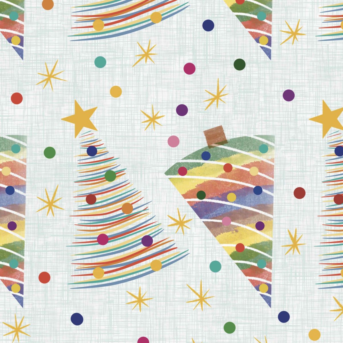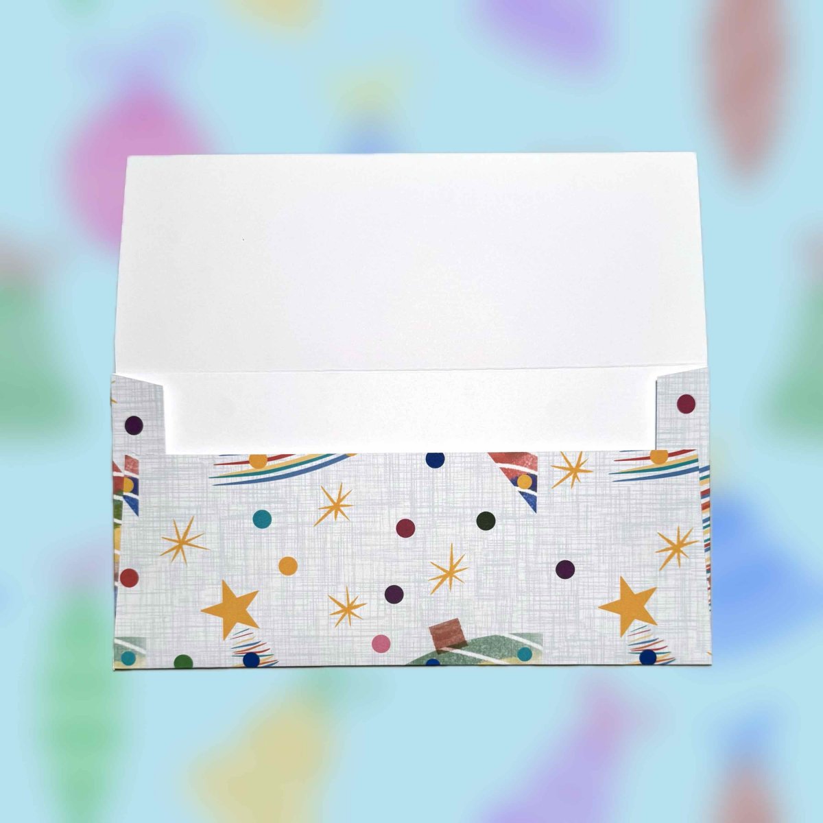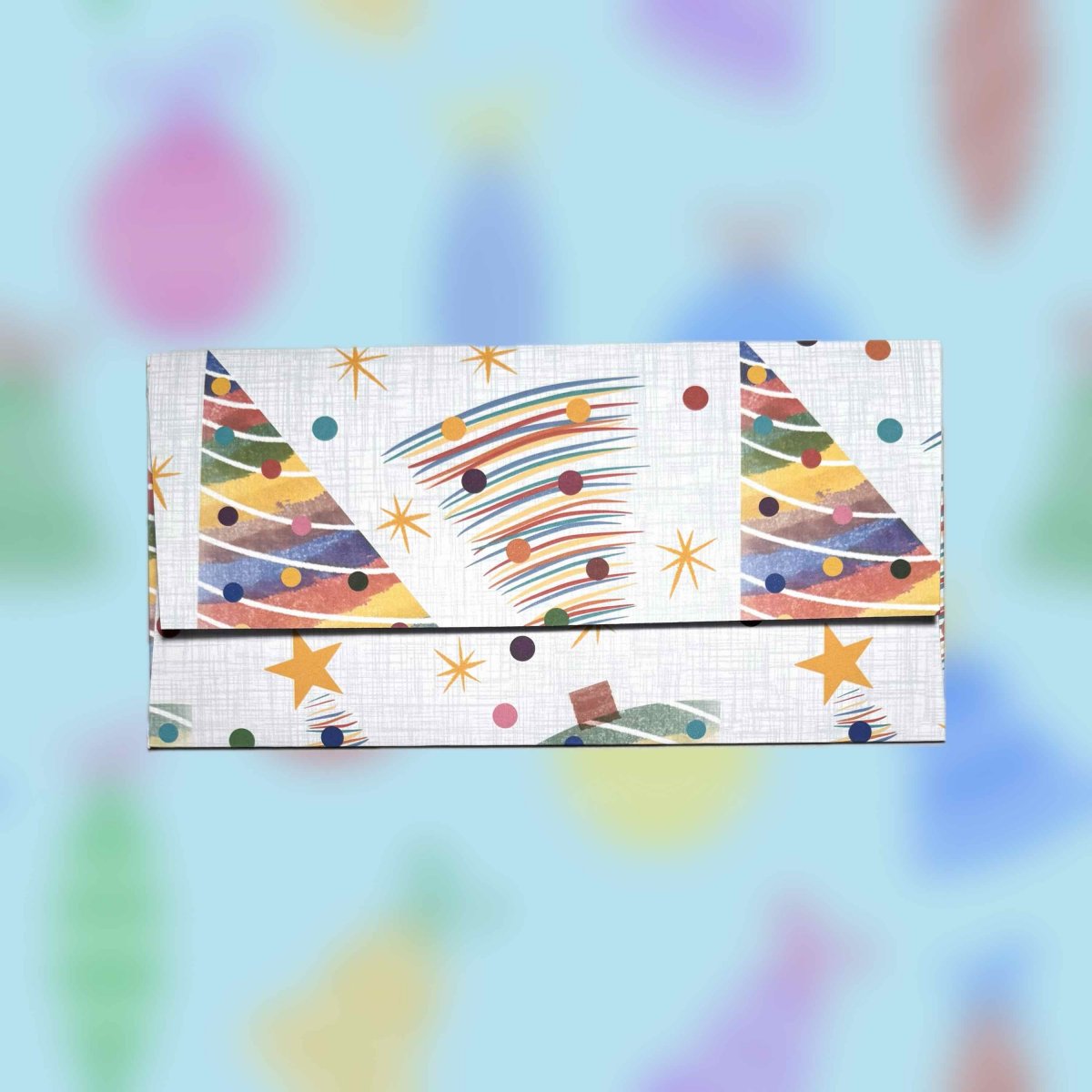 Papírová darovací ručně skládaná obálka s potiskem autorskou grafikou s motivem vánočních zdobených stromků trjúhelníkovéch tvarů v pastelových barvách na světle zeleném pozadí - velký vzor. Obálka z bílého papíru gramáže 160 g/m2 s inkoustovým potiskem.
