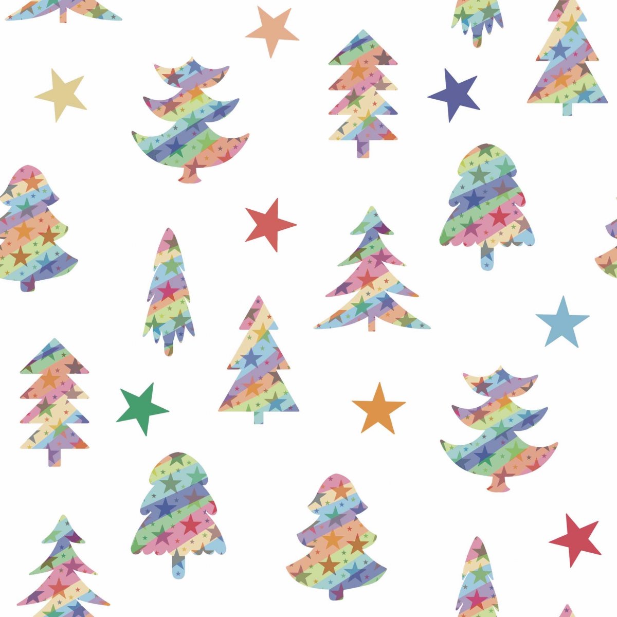 Papírová darovací ručně skládaná obálka s potiskem autorskou grafikou s motivem různě tvarovaných stromků v duhových barvách s hvězdičkami na bílém pozadí - velký vzor. Obálka z bílého papíru gramáže 160 g/m2 s inkoustovým potiskem.