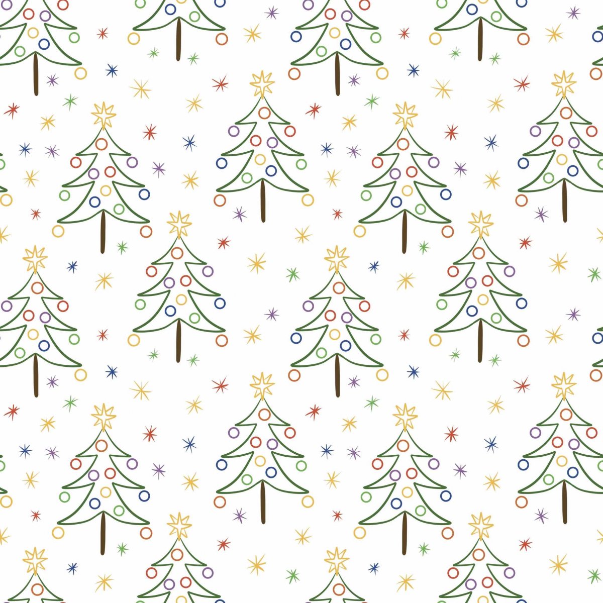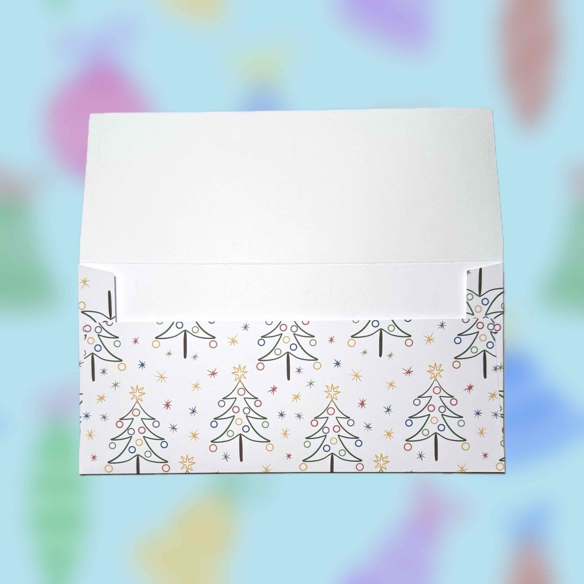 Papírová darovací ručně skládaná obálka s potiskem autorskou grafikou s motivem jednoduchých zdobených vánočních stromků s hvězdičkami na bílém pozadí. Obálka z bílého papíru gramáže 160 g/m2 s inkoustovým potiskem.