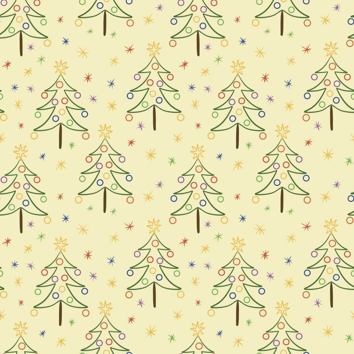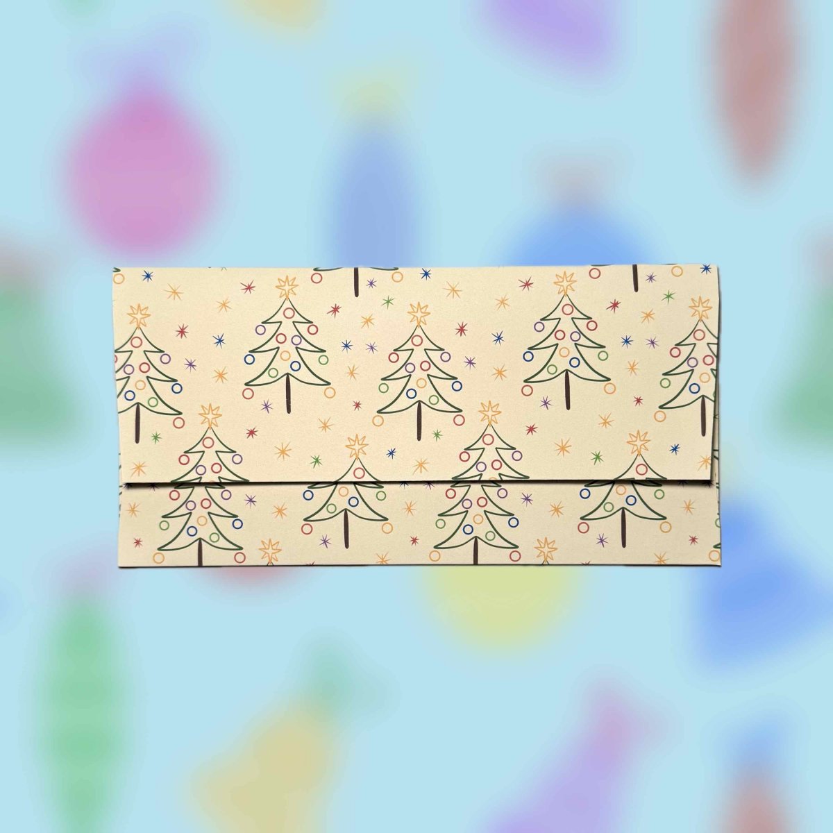 Papírová darovací ručně skládaná obálka s potiskem autorskou grafikou s motivem jednoduchých zdobených vánočních stromků s hvězdičkami na světle žlutém pozadí. Obálka z bílého papíru gramáže 160 g/m2 s inkoustovým potiskem.