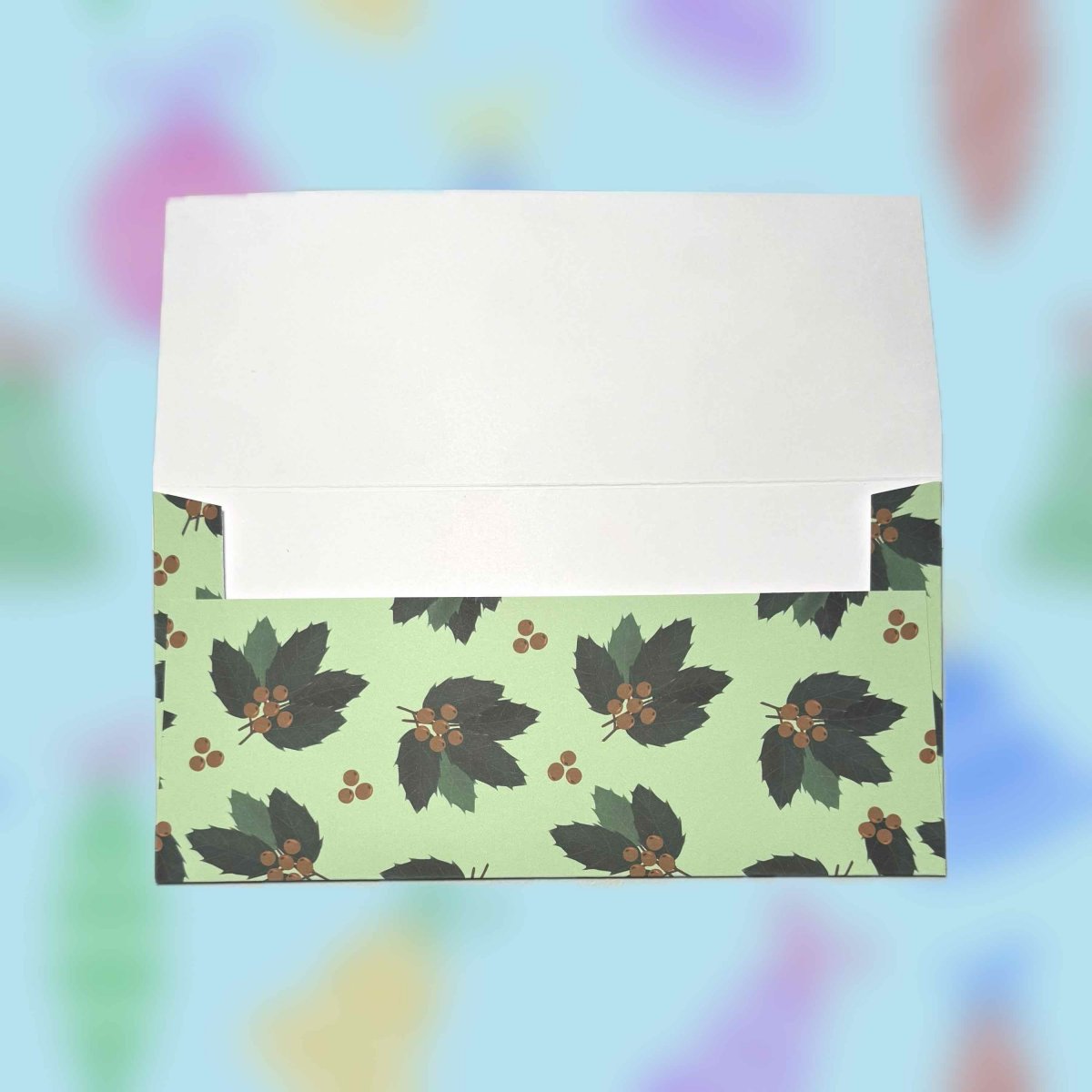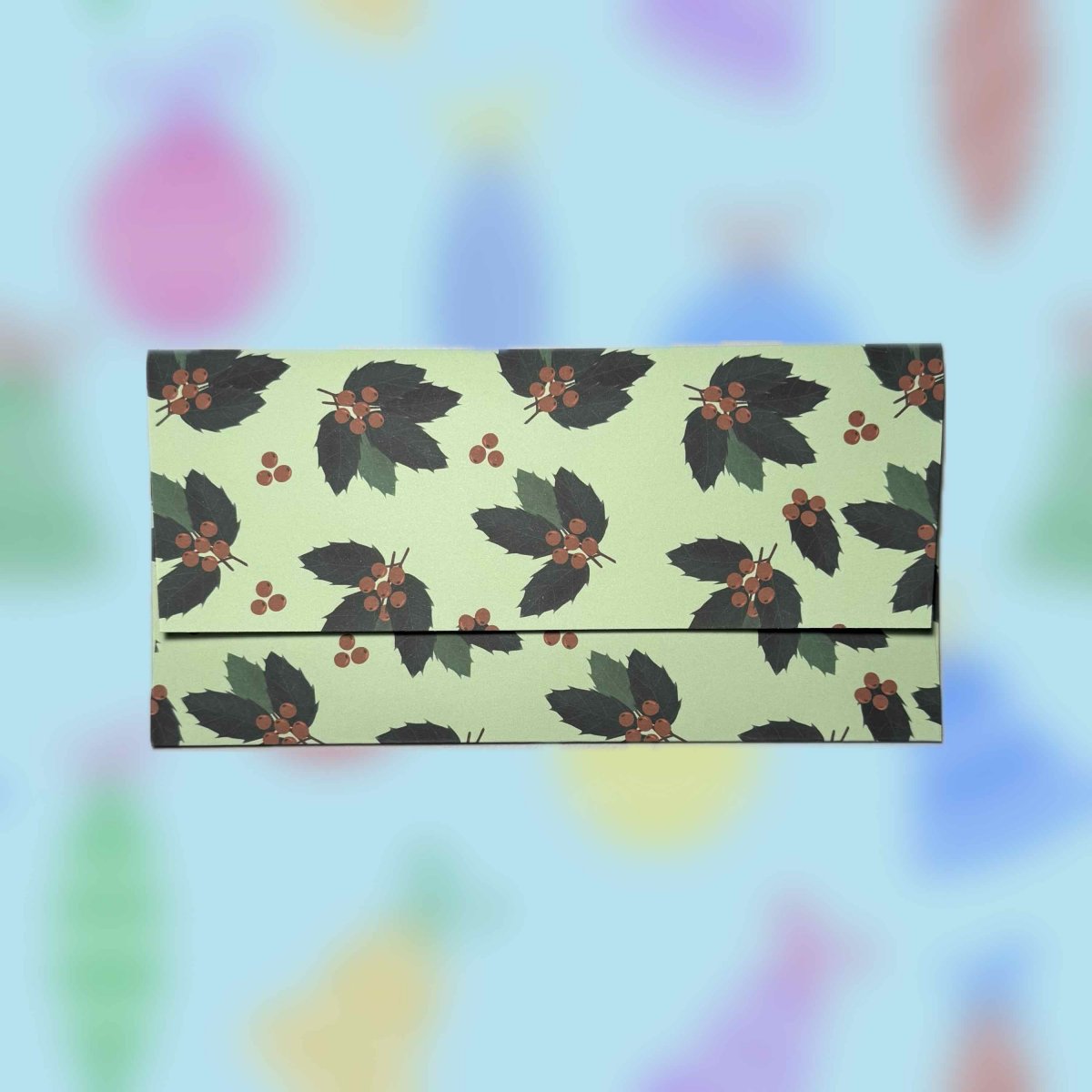 Papírová darovací ručně skládaná obálka s potiskem autorskou grafikou s motivem větviček zelené cesmíny s červenými plody na zeleném pozadí. Obálka z bílého papíru gramáže 160 g/m2 s inkoustovým potiskem.