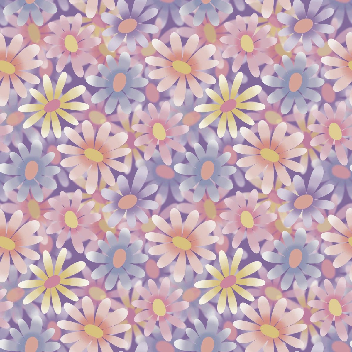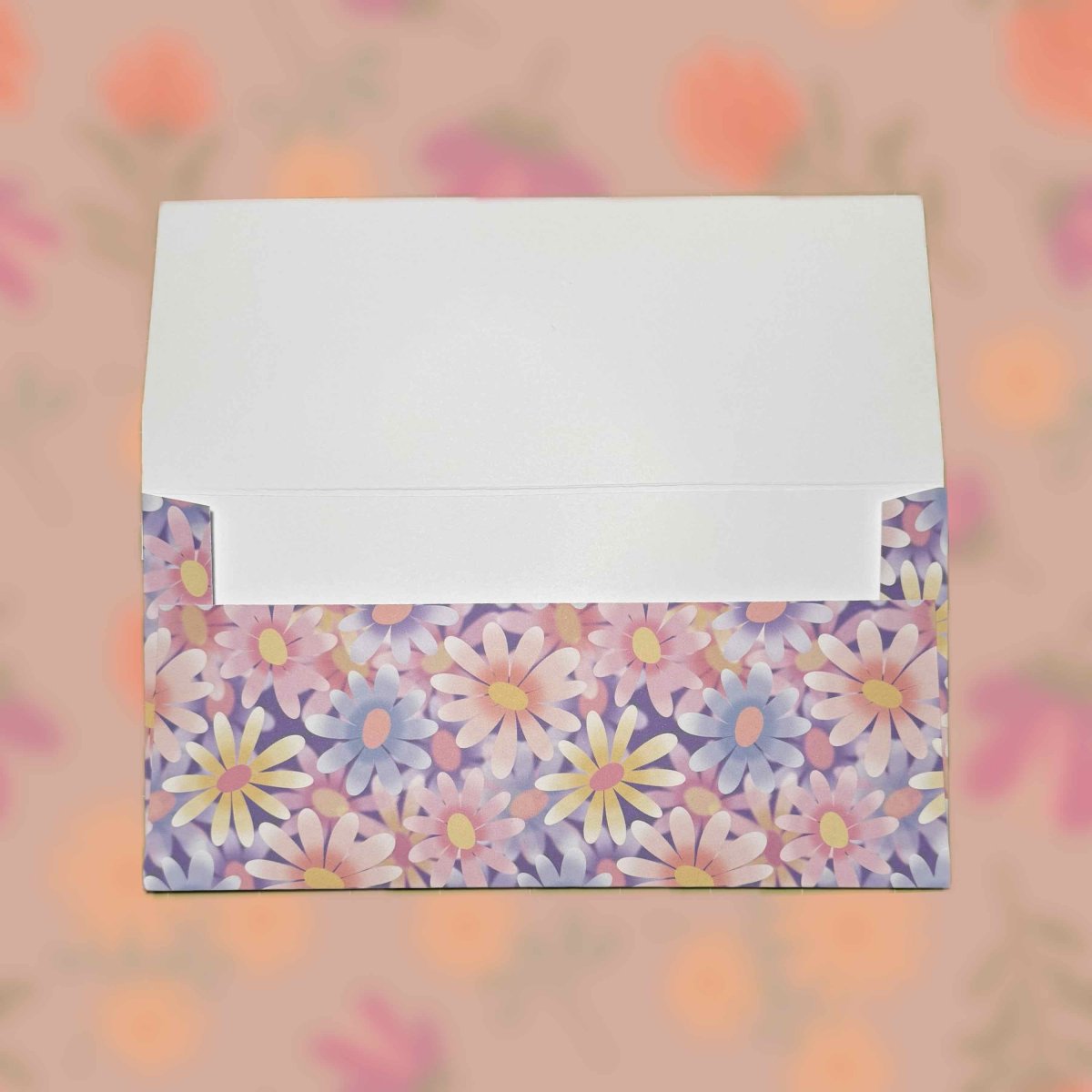 Papírová darovací ručně skládaná obálka s potiskem autorskou grafikou s motivem mnoha abstraktních květů ve světle modré, žluté, růžové a oranžové barvě na fialovém pozadí. Obálka z bílého papíru gramáže 160 g/m2 s inkoustovým potiskem.