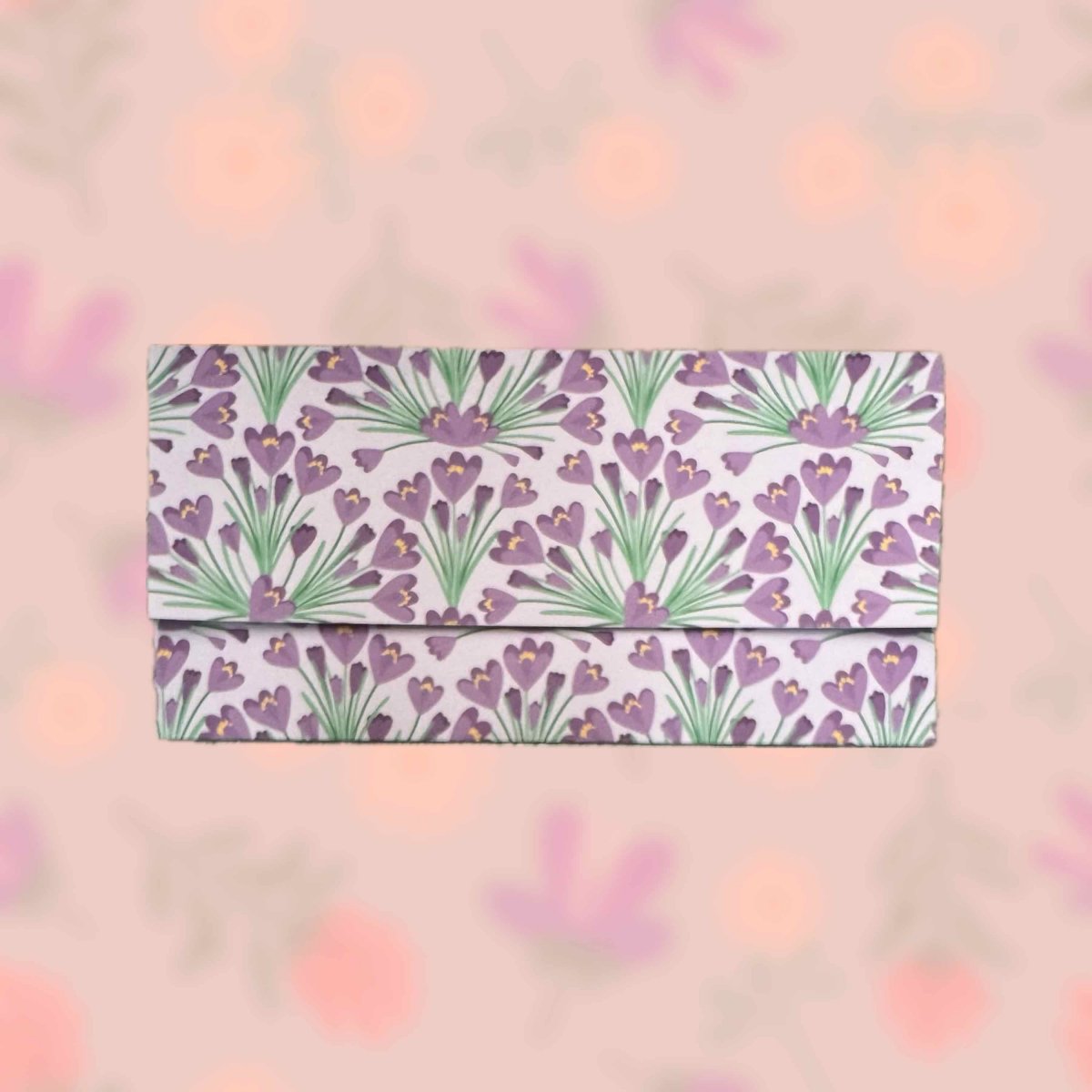 Papírová darovací ručně skládaná obálka s potiskem autorskou grafikou s motivem abstraktních kvetoucích tmavě fialových krokusů na světle fialovém pozadí. Obálka z bílého papíru gramáže 160 g/m2 s inkoustovým potiskem.