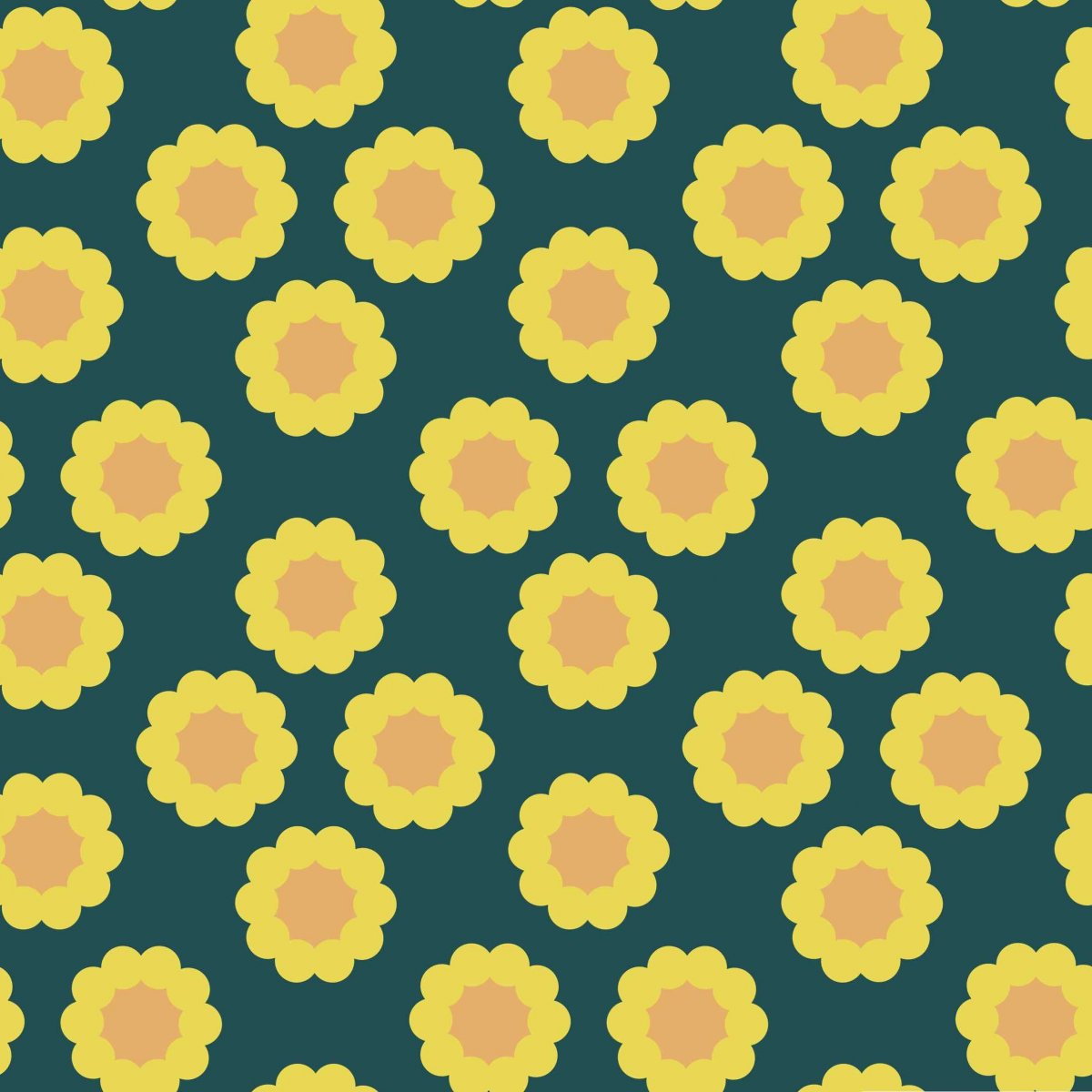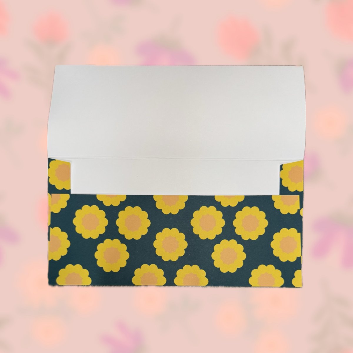 Papírová darovací ručně skládaná obálka s potiskem autorskou grafikou se žlutými retro květy na tmavém modro-zeleném pozadí pozadí. Obálka z bílého papíru gramáže 160 g/m2 s inkoustovým potiskem.
