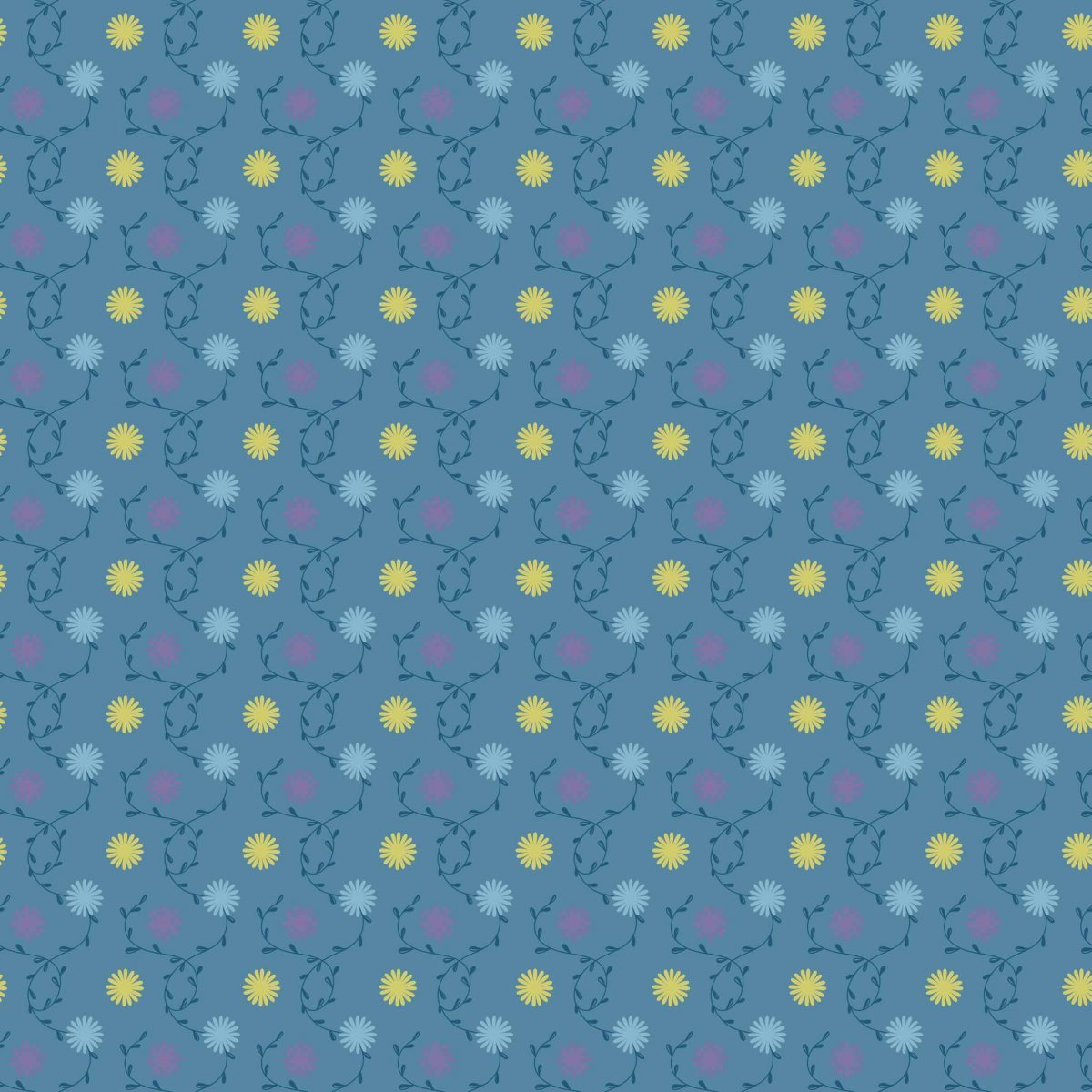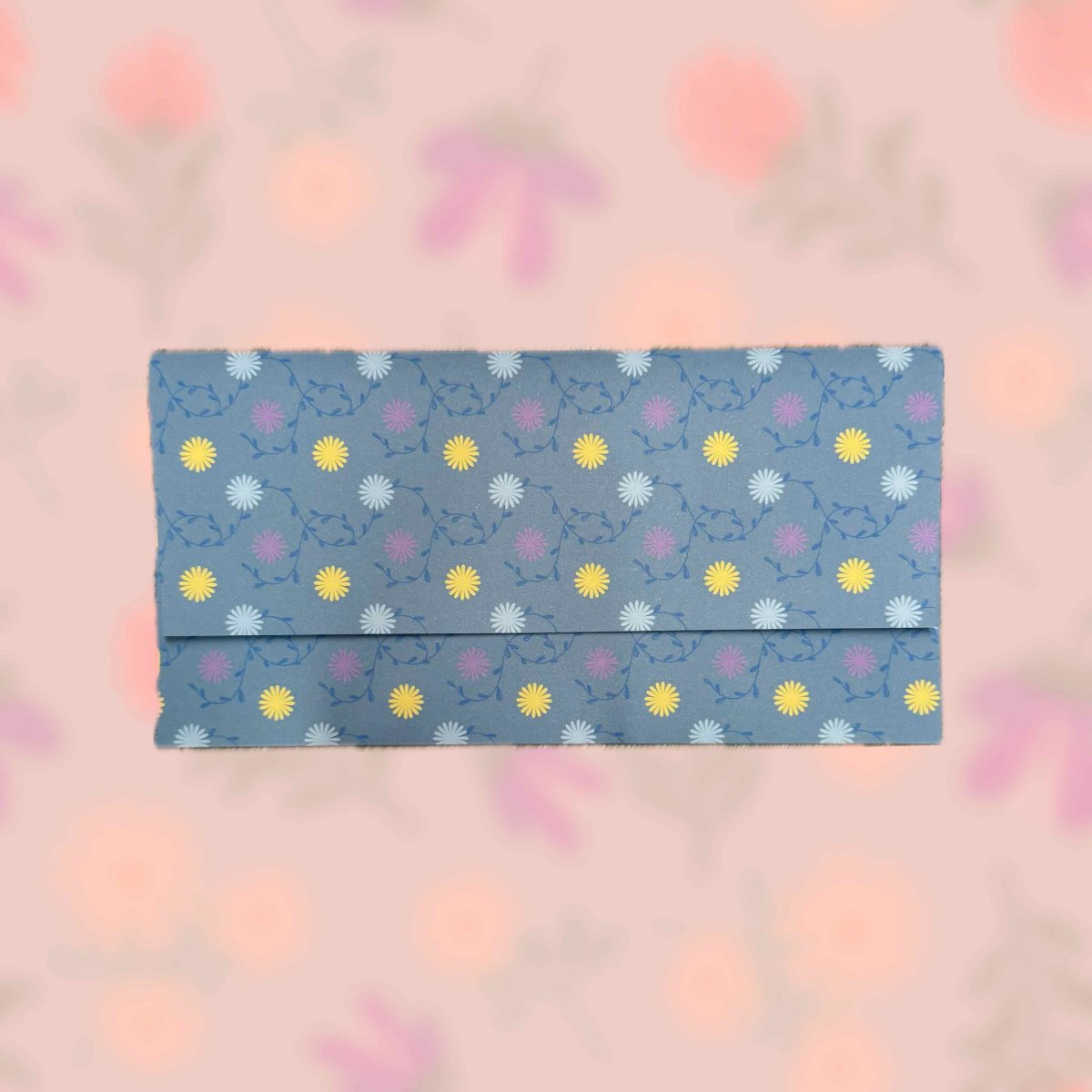 Papírová darovací ručně skládaná obálka s potiskem autorskou grafikou s drobnými žlutými, světle modrými a růžovými kvítky na šedomodrém pozadí. Obálka z bílého papíru gramáže 160 g/m2 s inkoustovým potiskem.