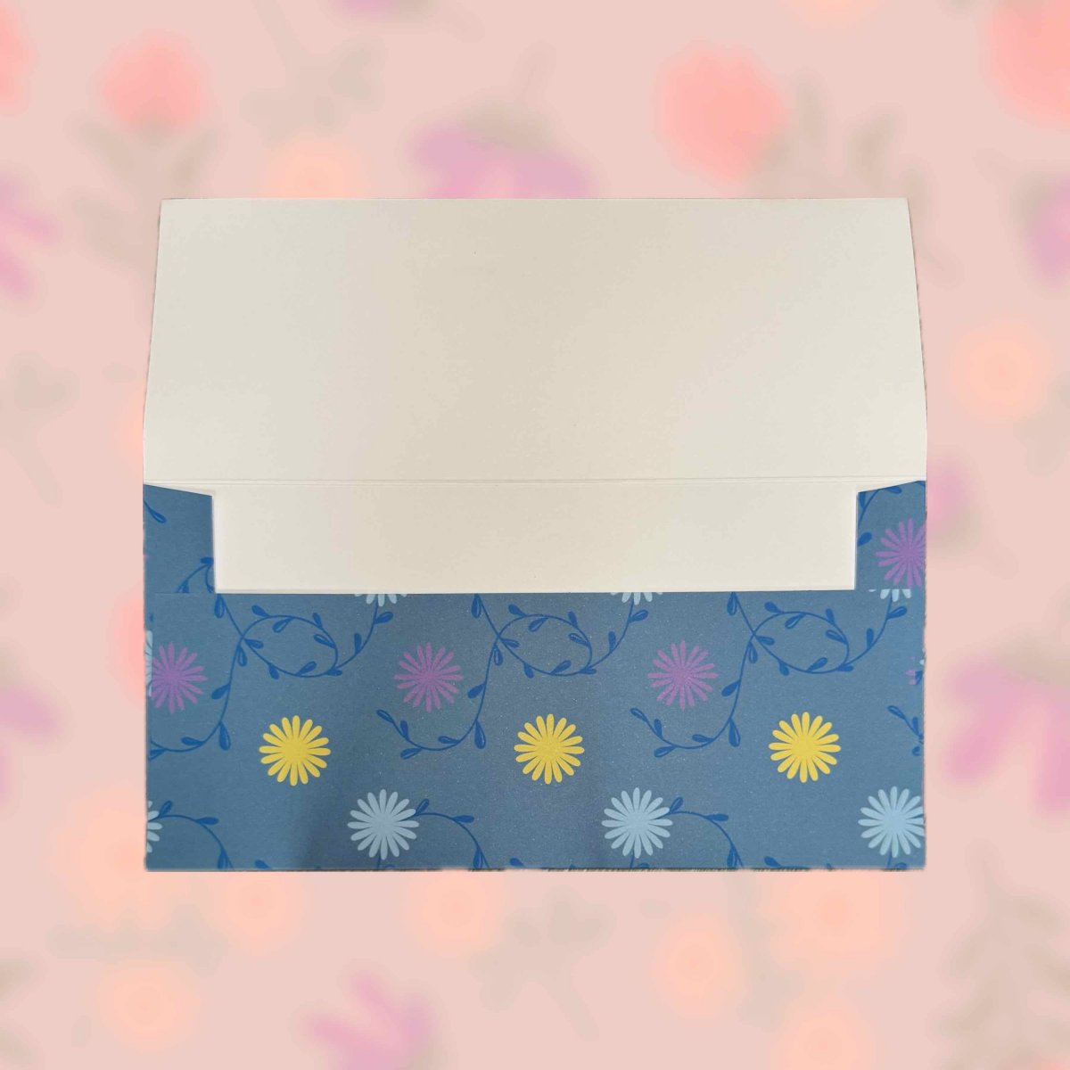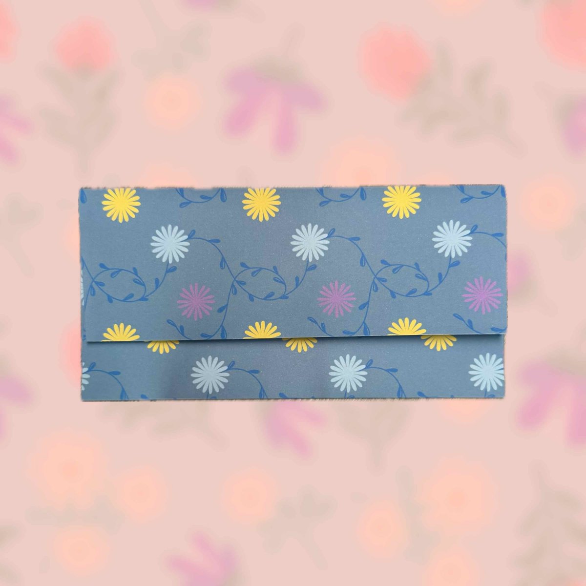 Papírová darovací ručně skládaná obálka s potiskem autorskou grafikou se žlutými, světle modrými a růžovými kvítky na šedomodrém pozadí - velký vzor. Obálka z bílého papíru gramáže 160 g/m2 s inkoustovým potiskem.