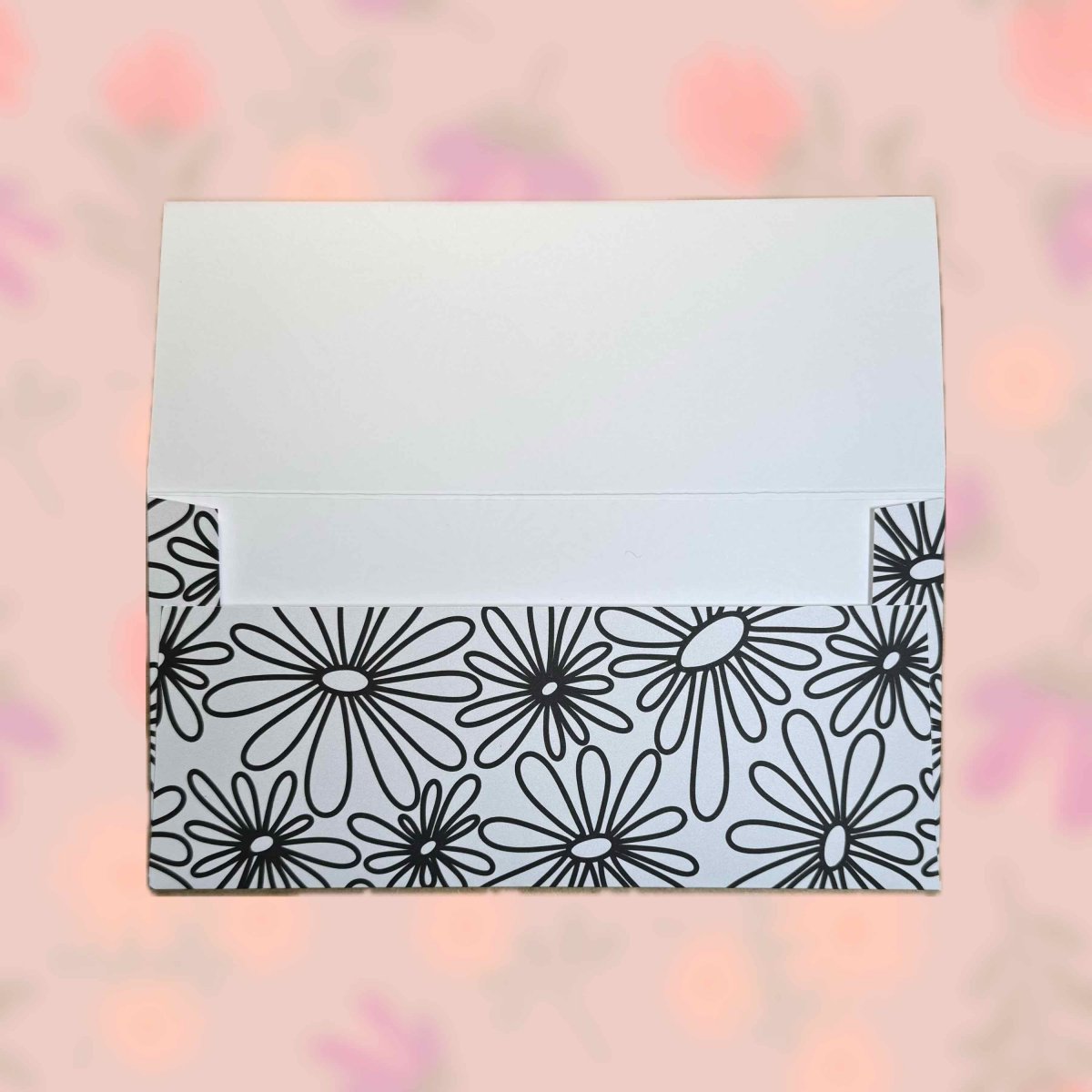 Papírová darovací ručně skládaná obálka s potiskem autorskou grafikou s abstraktními černo-bílými květy s možností dobarvení - vybarvovánky - velký vzor. Obálka z bílého papíru gramáže 160 g/m2 s inkoustovým potiskem.