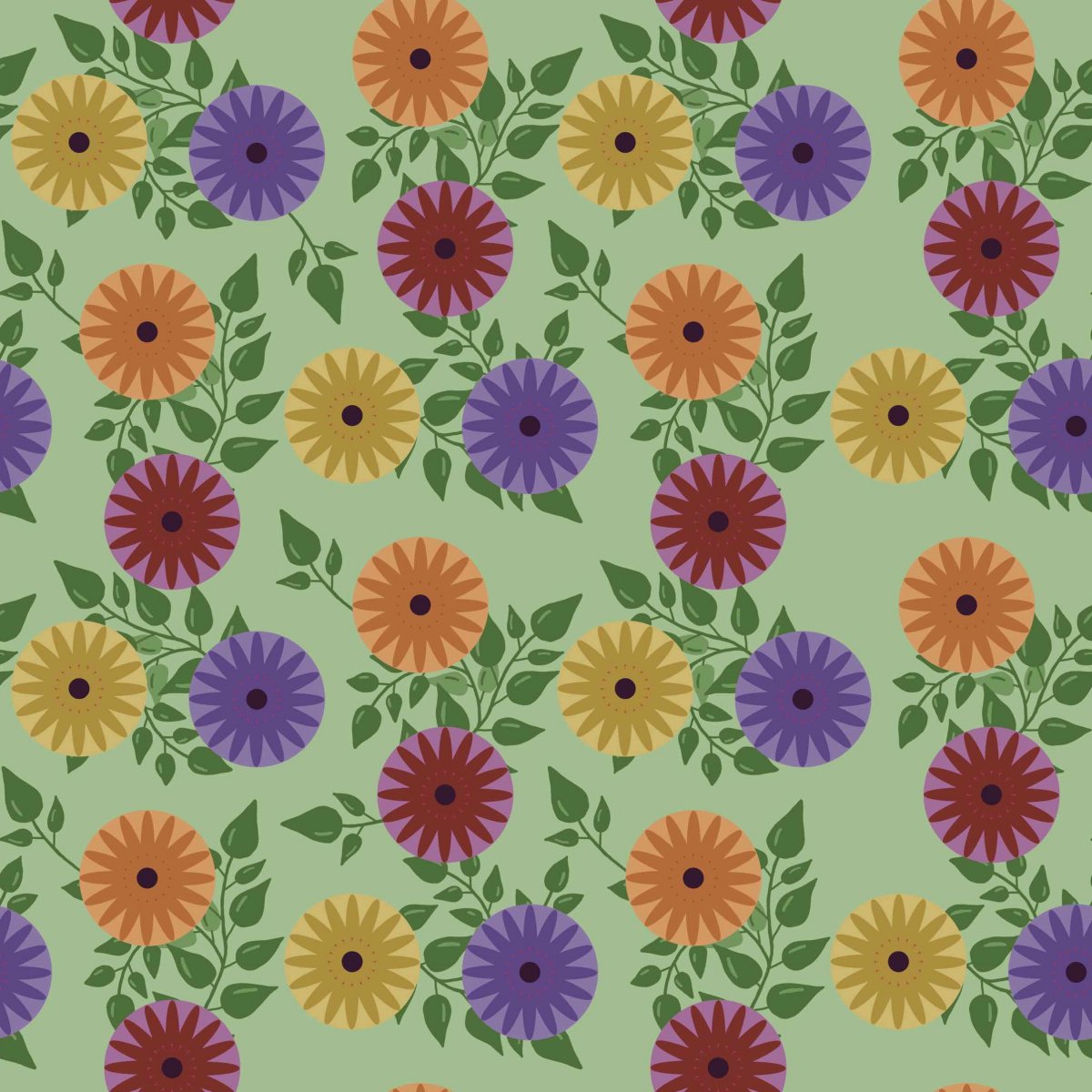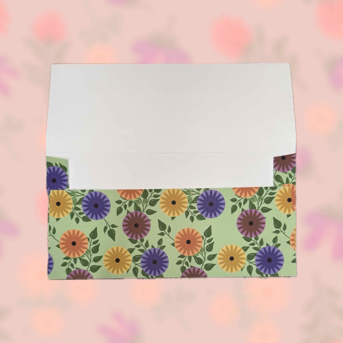 Papírová darovací ručně skládaná obálka s potiskem autorskou grafikou s barevnými retro květy s lístky na hráškově zeleném pozadí. Obálka z bílého papíru gramáže 160 g/m2 s inkoustovým potiskem.