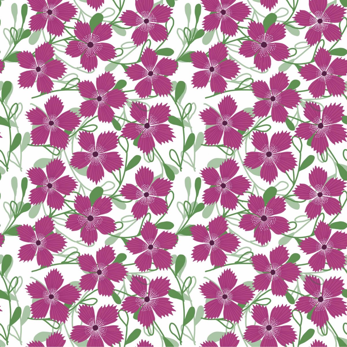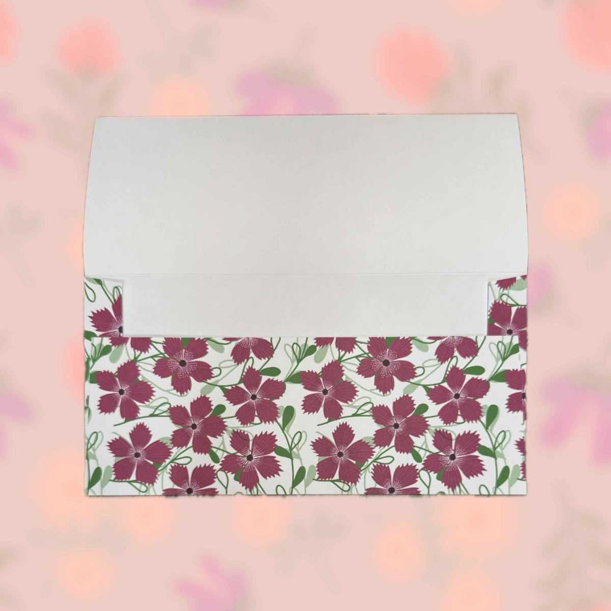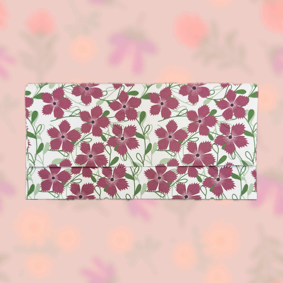 Papírová darovací ručně skládaná obálka s potiskem autorskou grafikou s drobnými jemnými růžovými kvítky s lístečky na bílém pozadí. Obálka z bílého papíru gramáže 160 g/m2 s inkoustovým potiskem.
