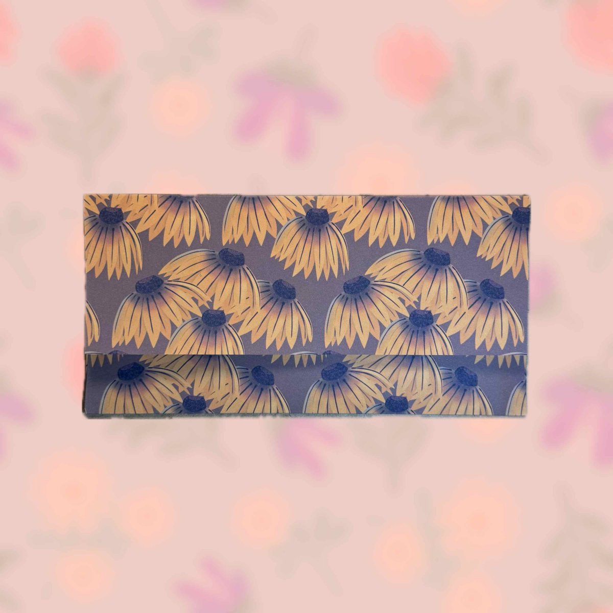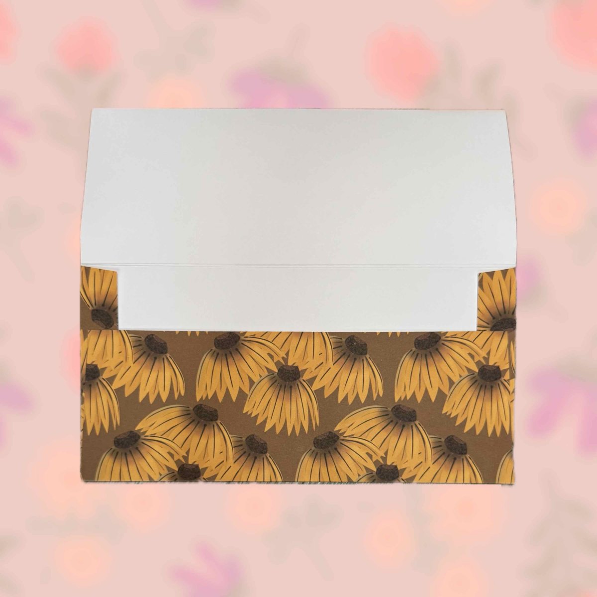 Papírová darovací ručně skládaná obálka s potiskem autorskou grafikou se žlutými květy třapatky na hnědém pozadí. Obálka z bílého papíru gramáže 160 g/m2 s inkoustovým potiskem.