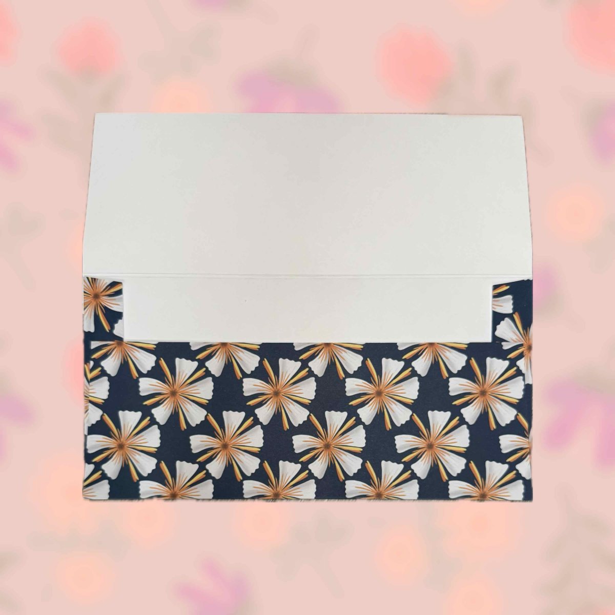 Papírová darovací ručně skládaná obálka s potiskem autorskou grafikou s abstraktními bílými květy na tmavě modrém pozadí. Obálka z bílého papíru gramáže 160 g/m2 s inkoustovým potiskem.