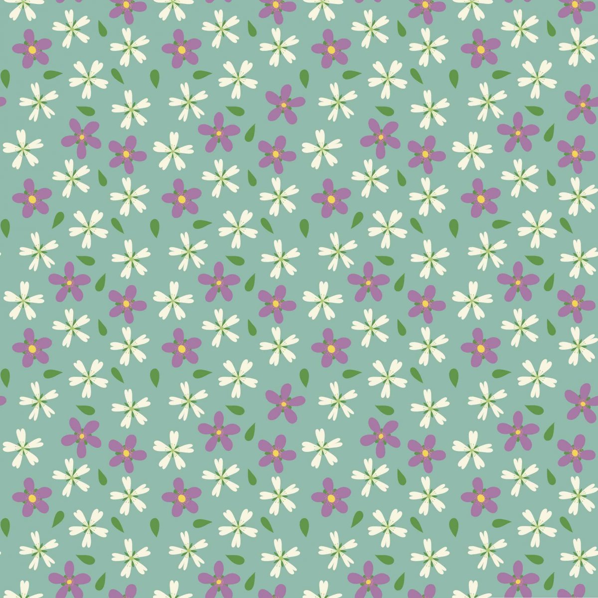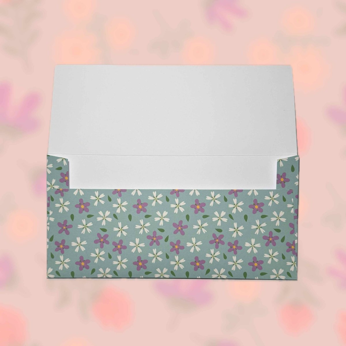Papírová darovací ručně skládaná obálka s potiskem autorskou grafikou - drobná fialová a bílá kvítka s lístečky na světle petrolejovém pozadí.