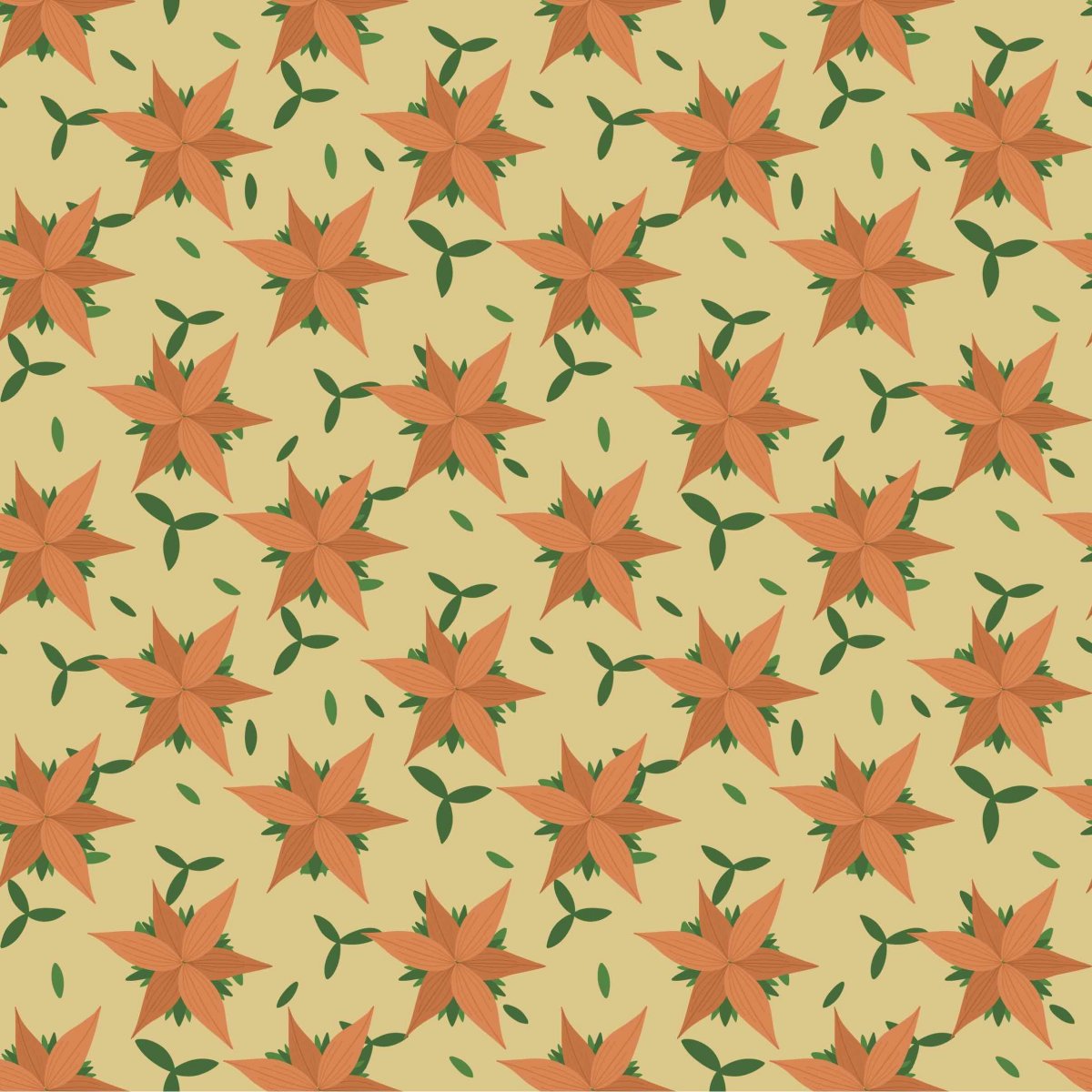 Papírová darovací ručně skládaná obálka s potiskem autorskou grafikou - abstraktní oranžové hvězdicové květy na žlutém pozadí.