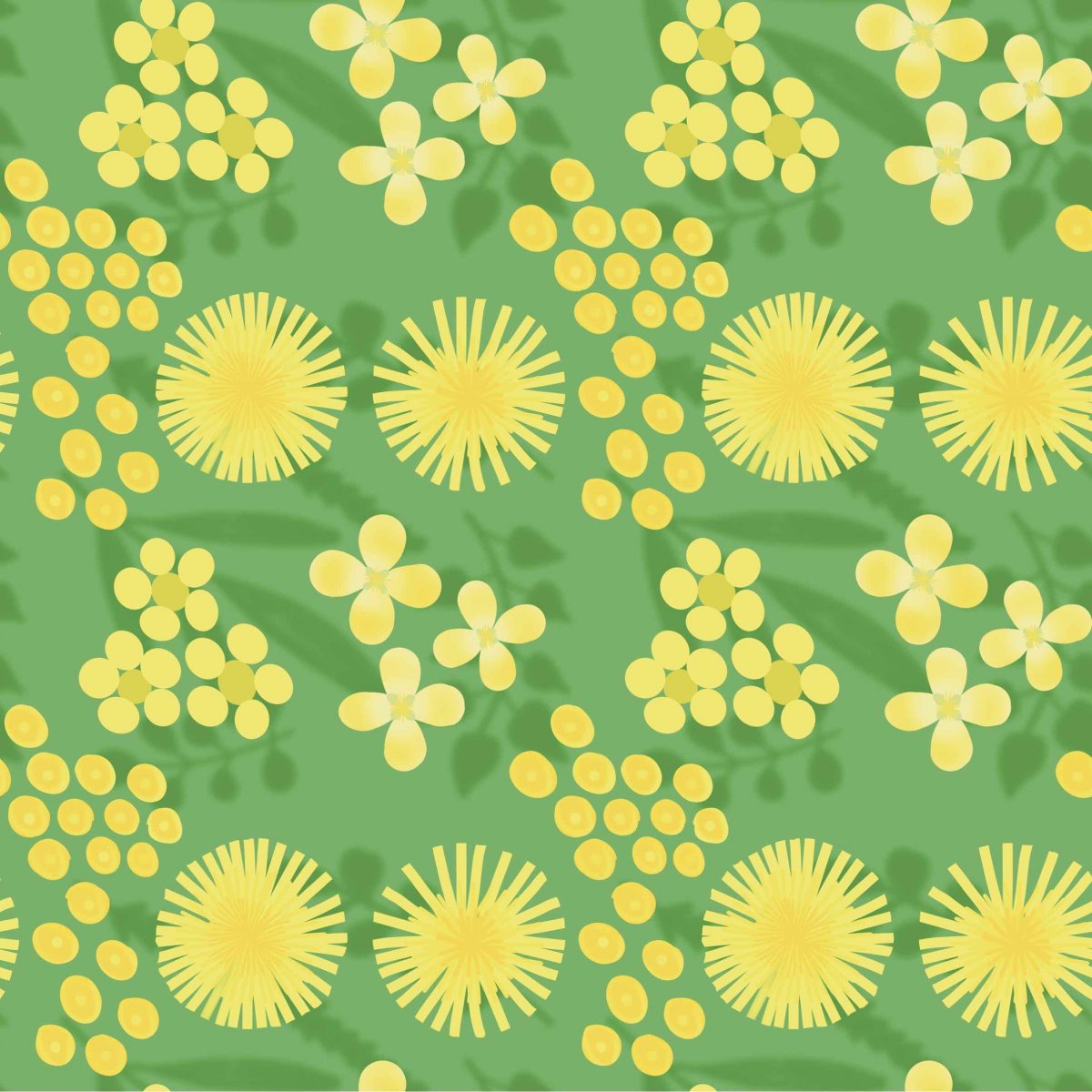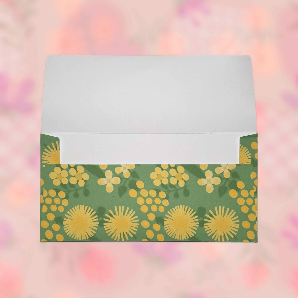 Papírová darovací ručně skládaná obálka s potiskem autorskou grafikou - směs různých žlutých květů na zeleném pozadí.