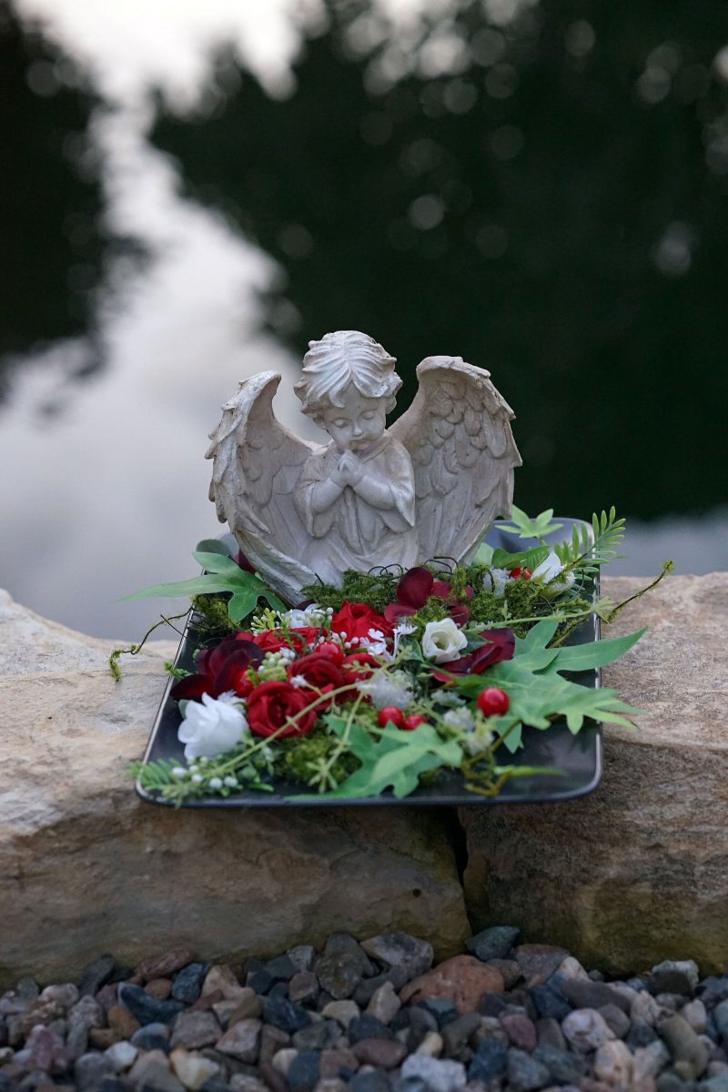 Vzpomínková dekorace na hrob na černém základu. Kombinace bílé, červené a zalené barvy. Květiny jsou látkové, doplněné andělíčkem.