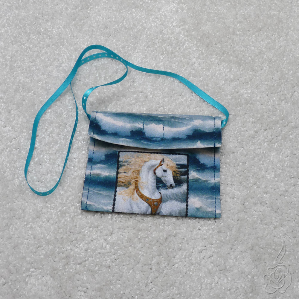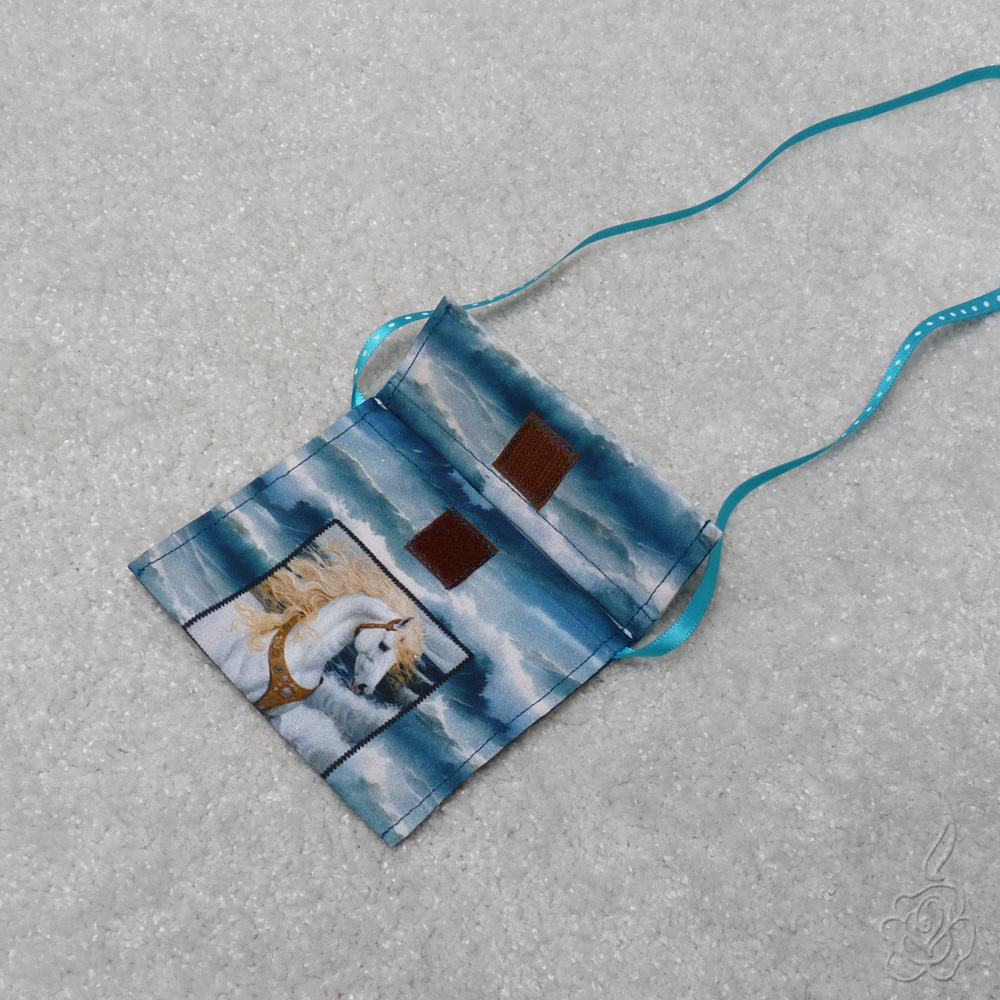 Jednoduchá taštička s klopnou na suchý zip. Dá se nosit na krk nebo přes rameno.