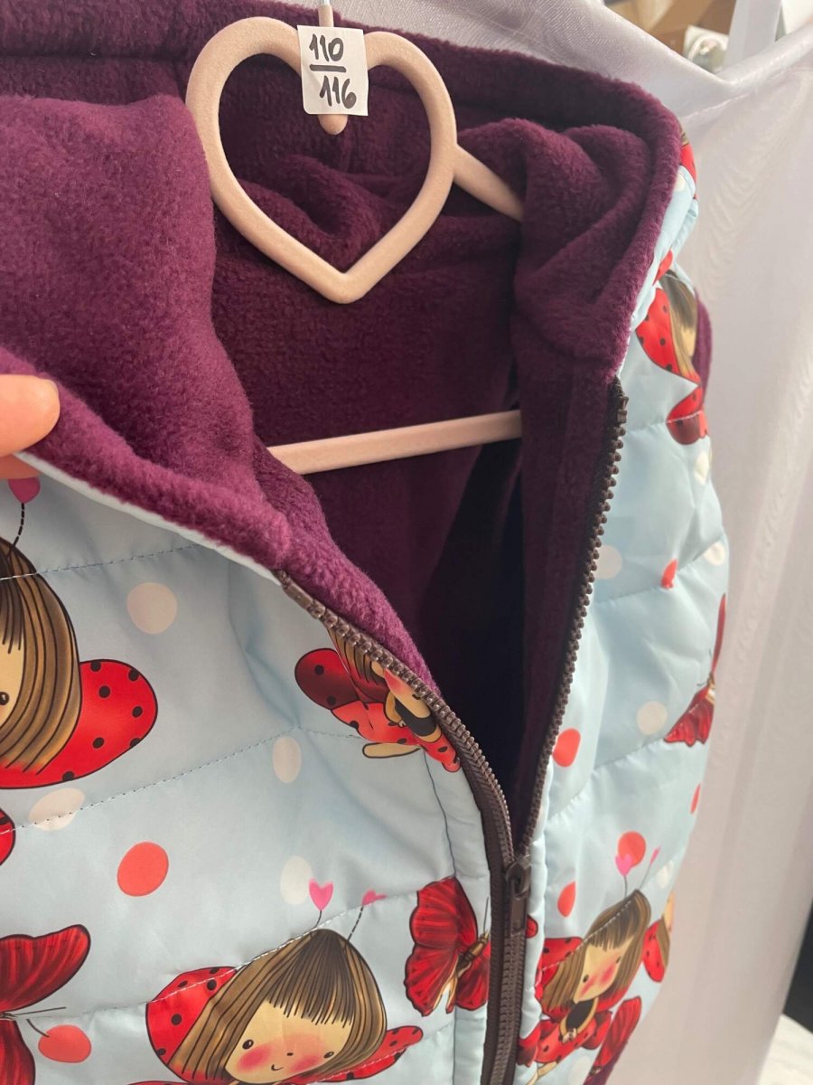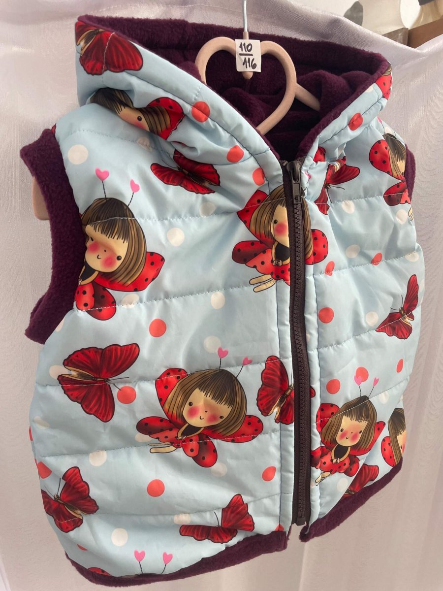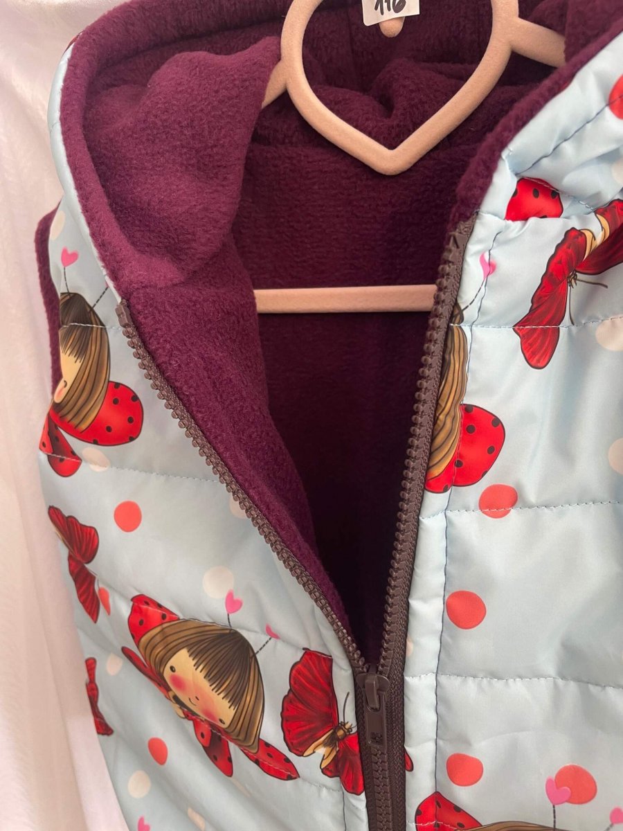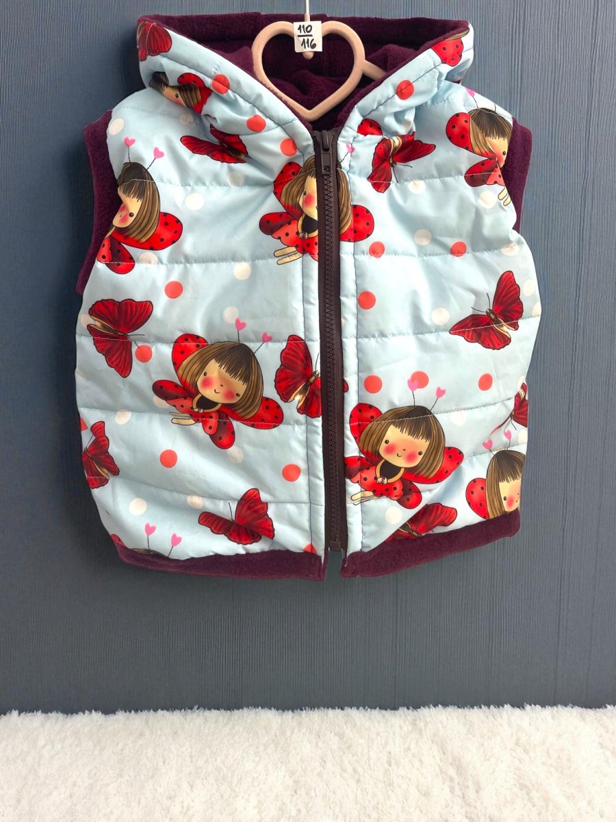 Teploučká a pohodlná vestička s kouzelným motivem víl a berušek. Zvenku jemný materiál s pastelově modrým podkladem, uvnitř vyteplená měkkým fleesem v bordó barvě – ideální na chladnější dny.