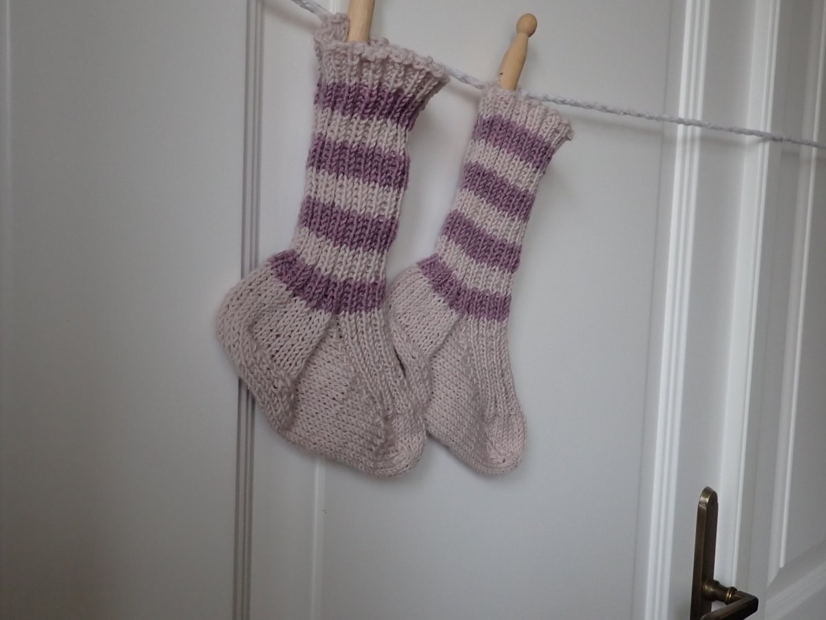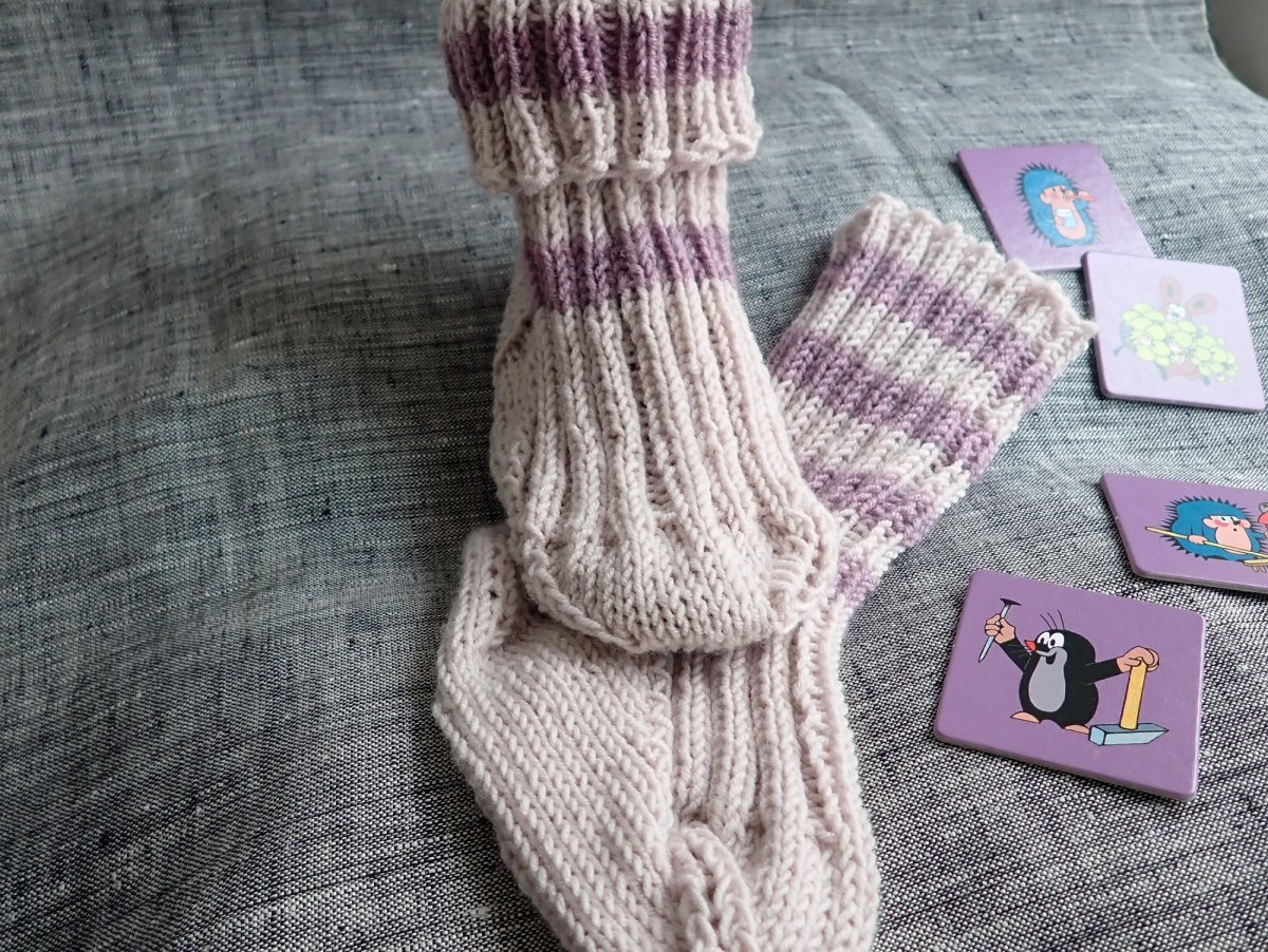 Dětské bezešvé ponožky pletené na 5 jehlicích dostatečně vysoké, aby nožka byla v teple.