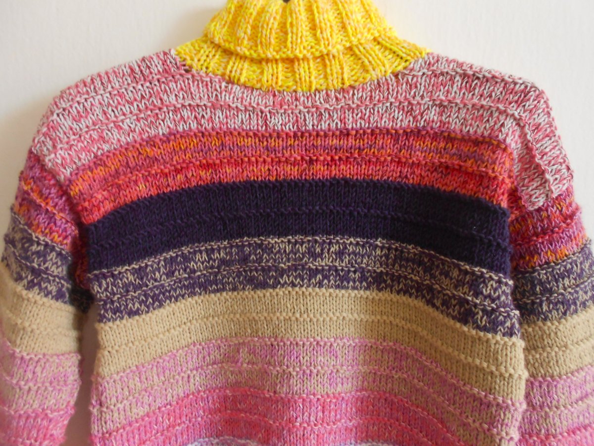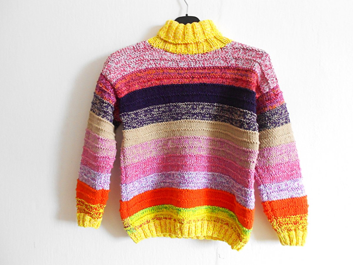 Dětský ručně pletený rolák s merinem, velikosti 128-134, délka 50 cm, šířka 41 cm, vnitřní délka rukávu 38 cm. Materiál: 60% merino, 20% akryl, 10% vlna, 10% bavlna. Barvy jsou výraznější než na fotografii.