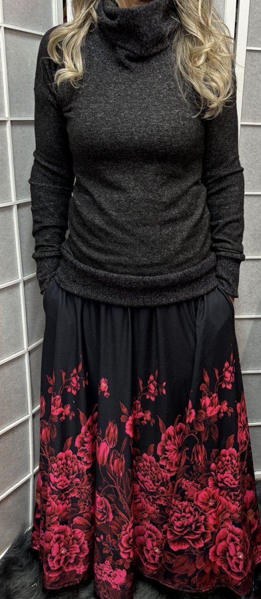 Dlouhá půlkolová sukně - květy na černé