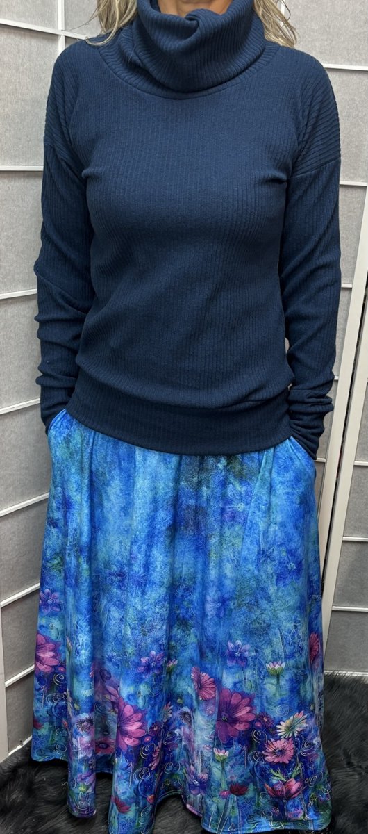 Dlouhá půlkolová sukně - květy na tyrkysu