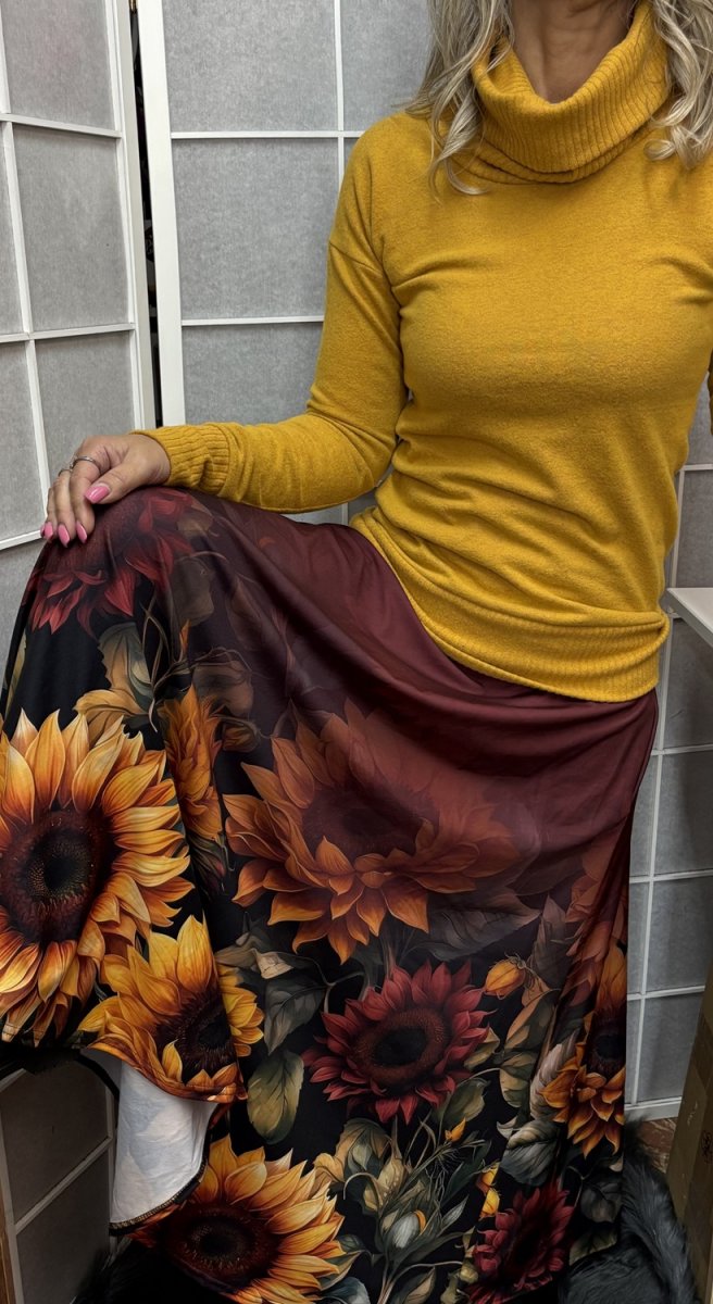 V bočních švech jsou všité kapsy. Do pásku je navlečená široká guma, kterou lze snadno upravit. Délka je ukončena coverlockem.