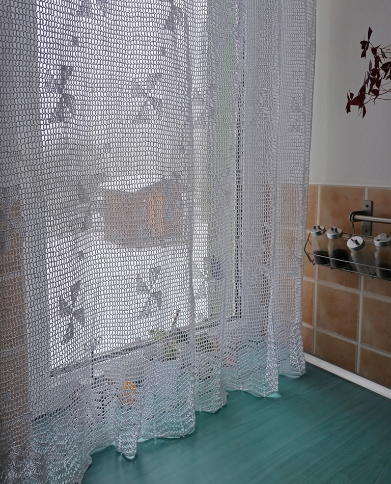 Háčkovaná záclonka z bavlněné příze. Pro pověšení můžete použít žabky nebo tyč. Záclona má v horním kraji otvory pro tyč. Na spodním okraji je bordura, která vytváří mírný kanýrek.