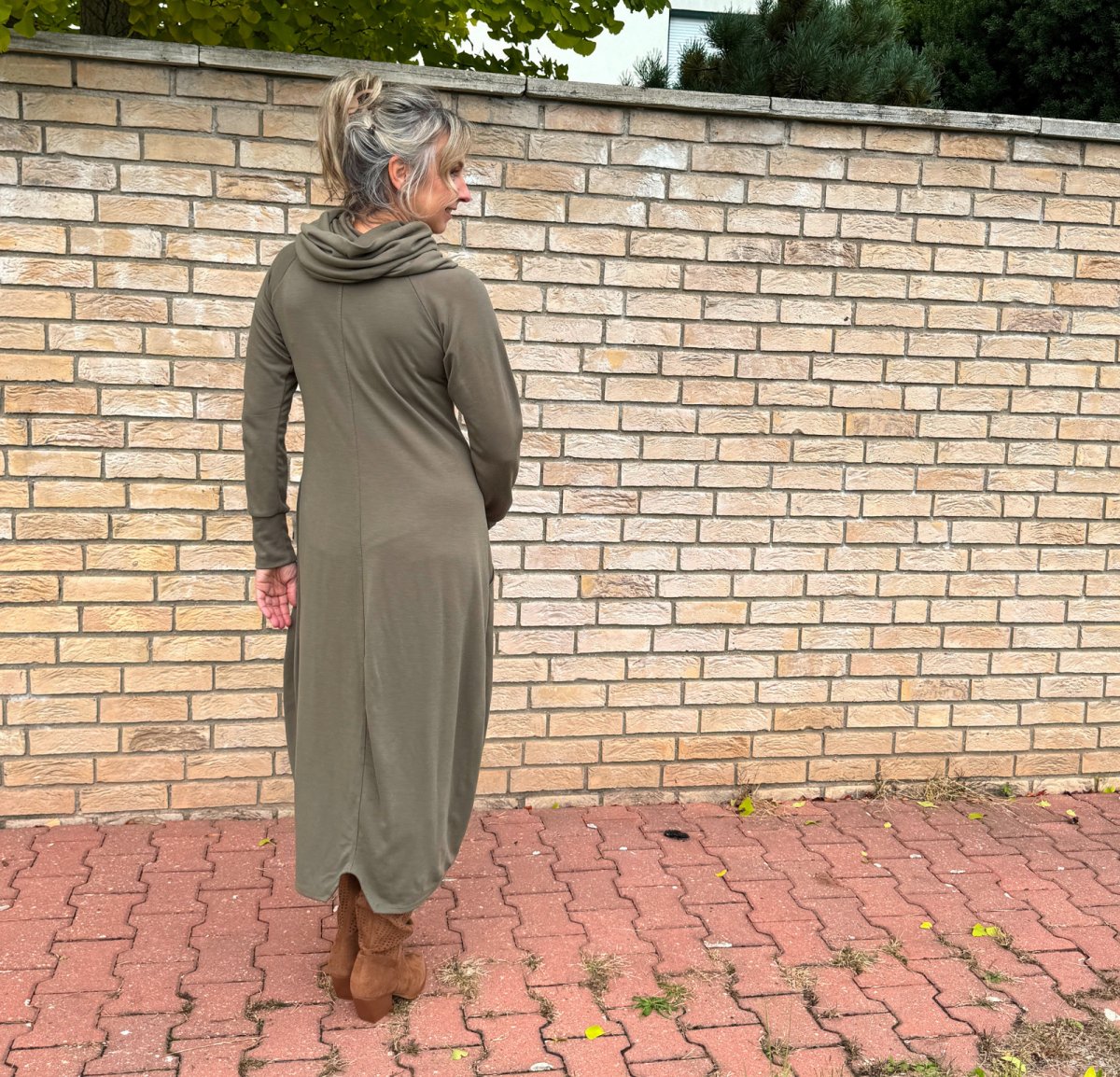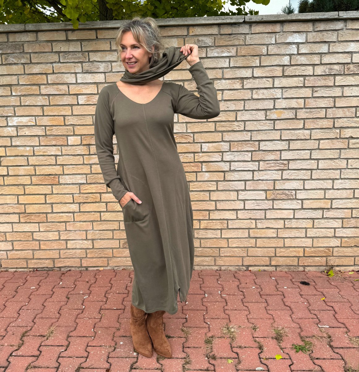 Pohodlné šaty ze středně silného úpletu (68%viskóza/28%polyester/4%elastan). balonového střihu s véčkovým výstřihem. Pro pohodlnou chůzi má sukně ve předu i vzadu výkroje do V. Na bocích jsou kapsy. Šaty mají dlouhý rukáv a součástí je stejnobarevný nákrčník.