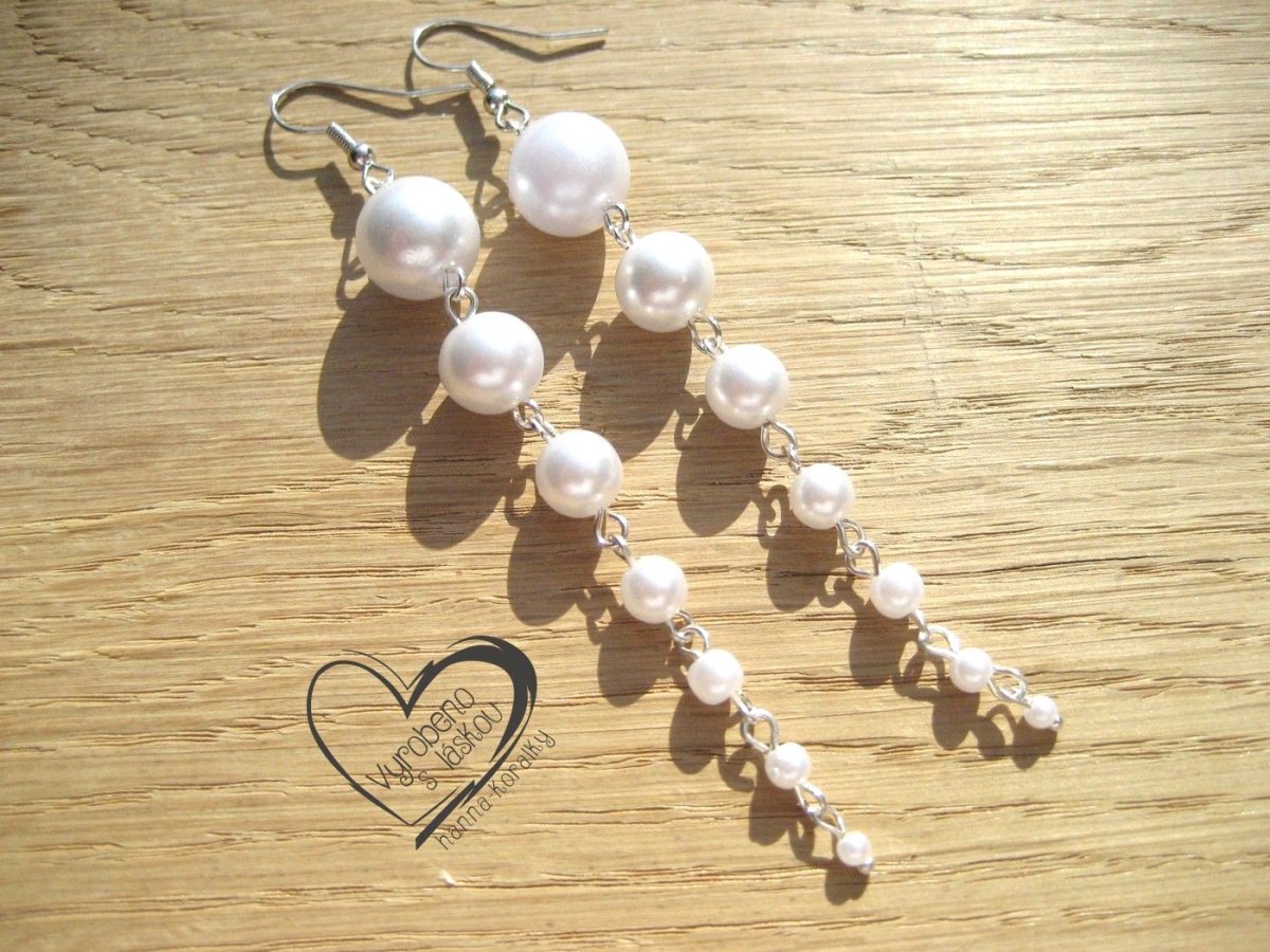 Dlouhé bílé elegantní a lehké náušnice ze 7 různých velikostí akrylových perel - korálků - od největší po nejmenší a bižuterního kovu, délka náušnic 8cm + náušnicový háček