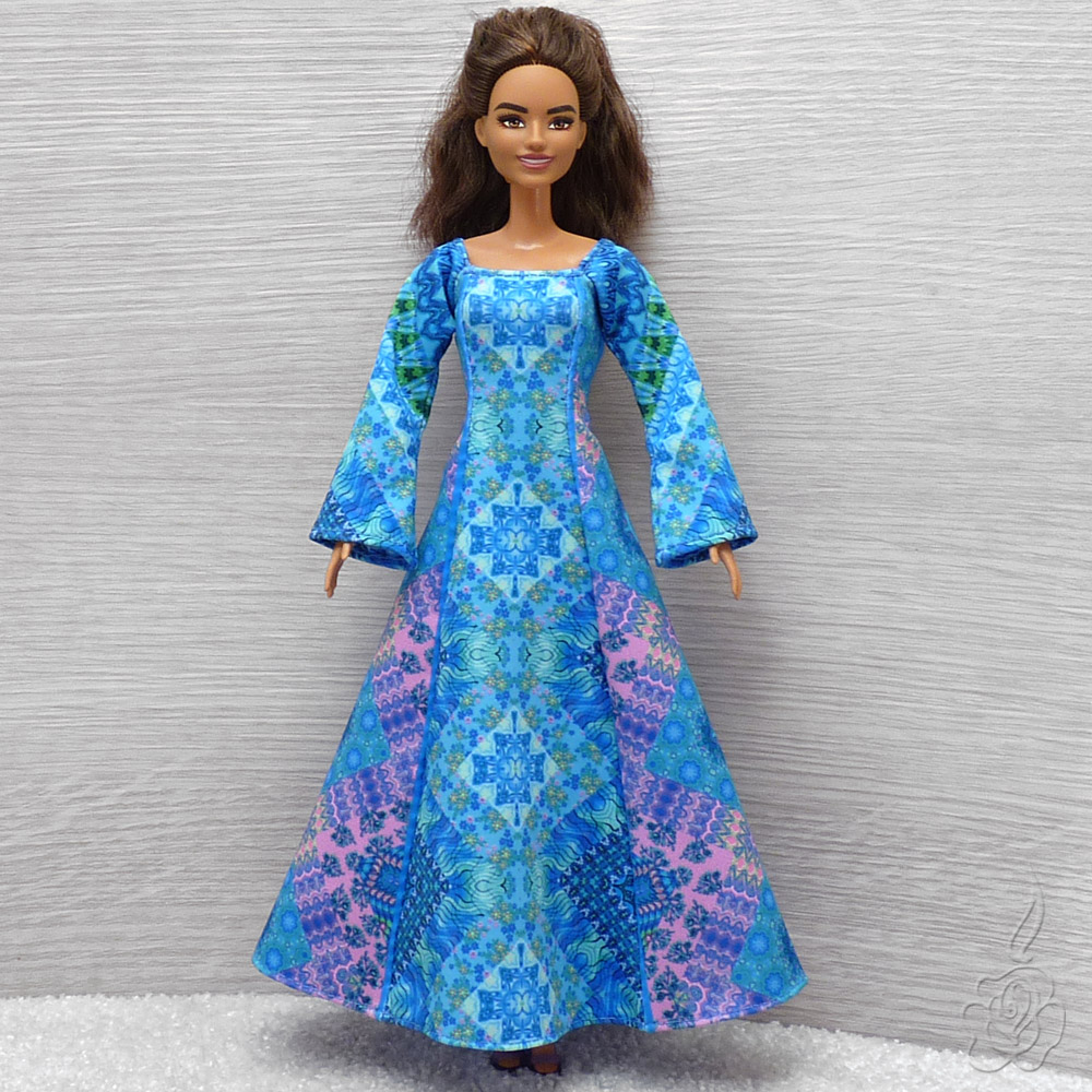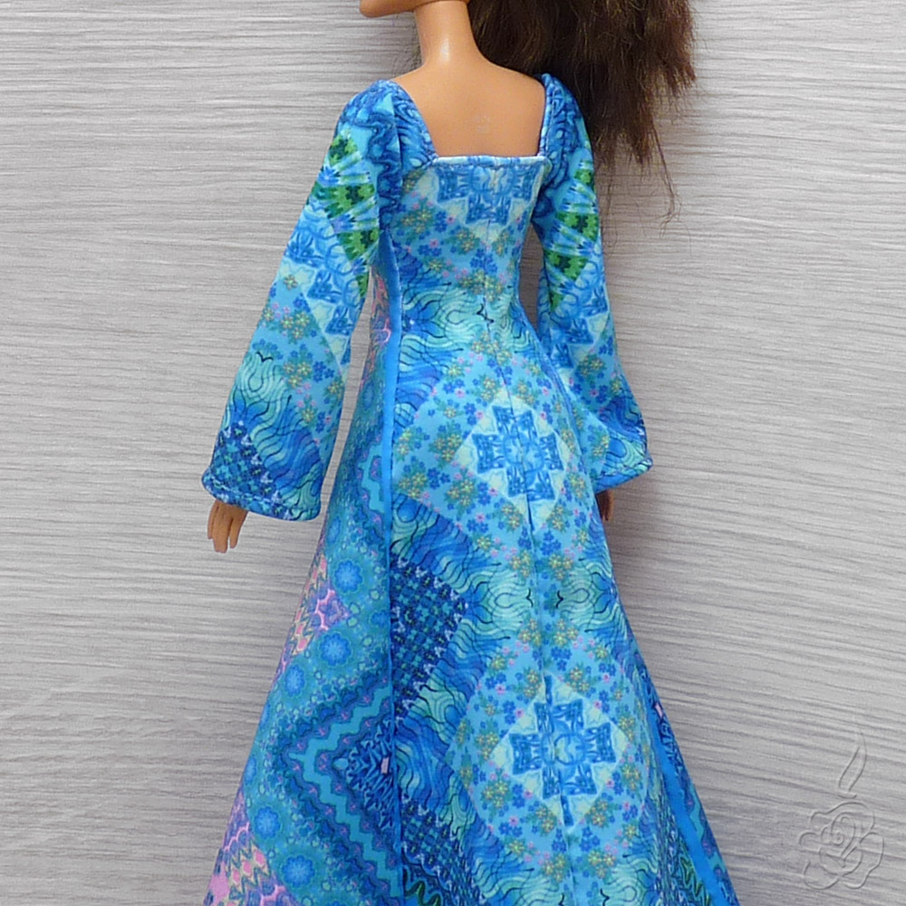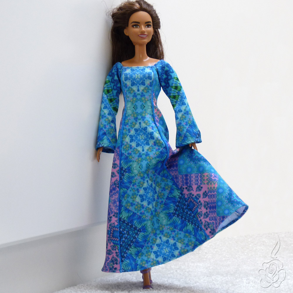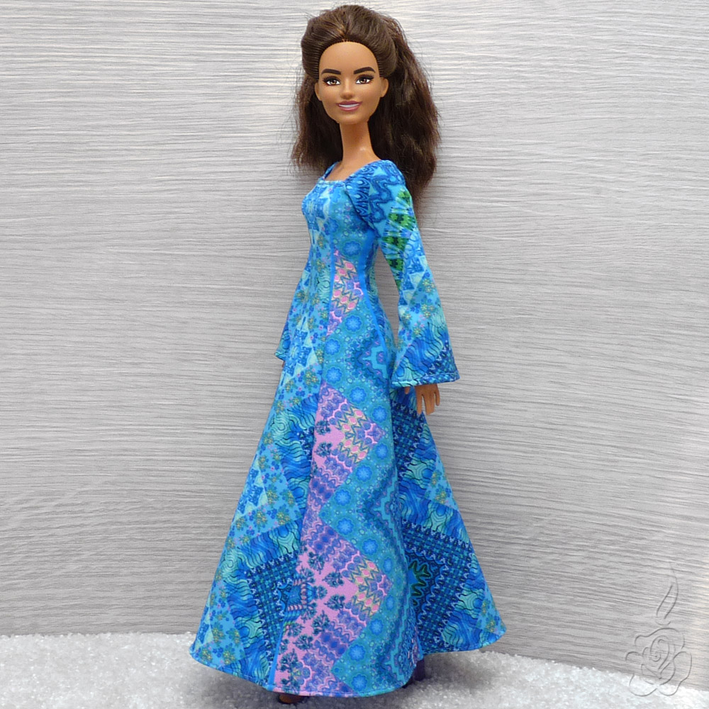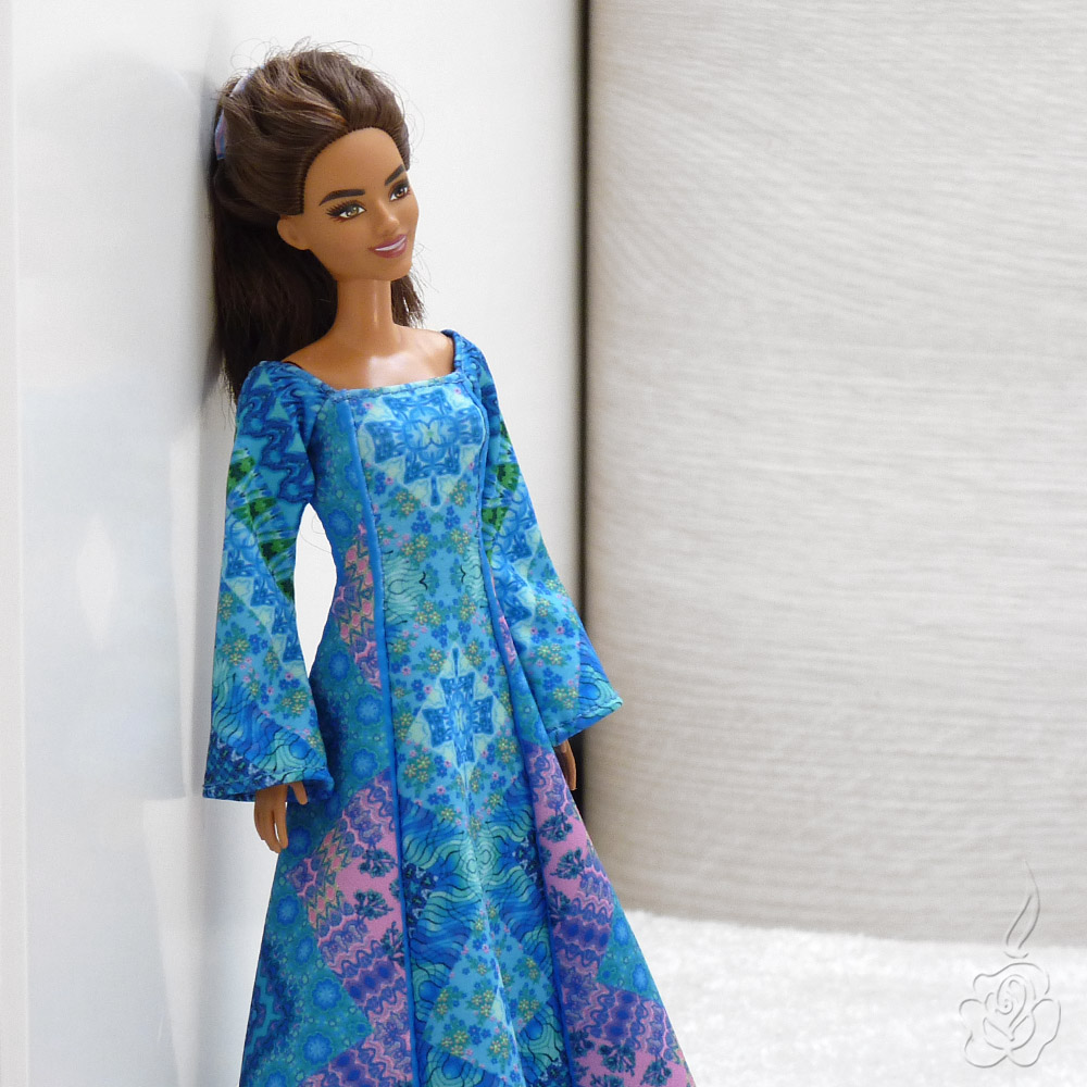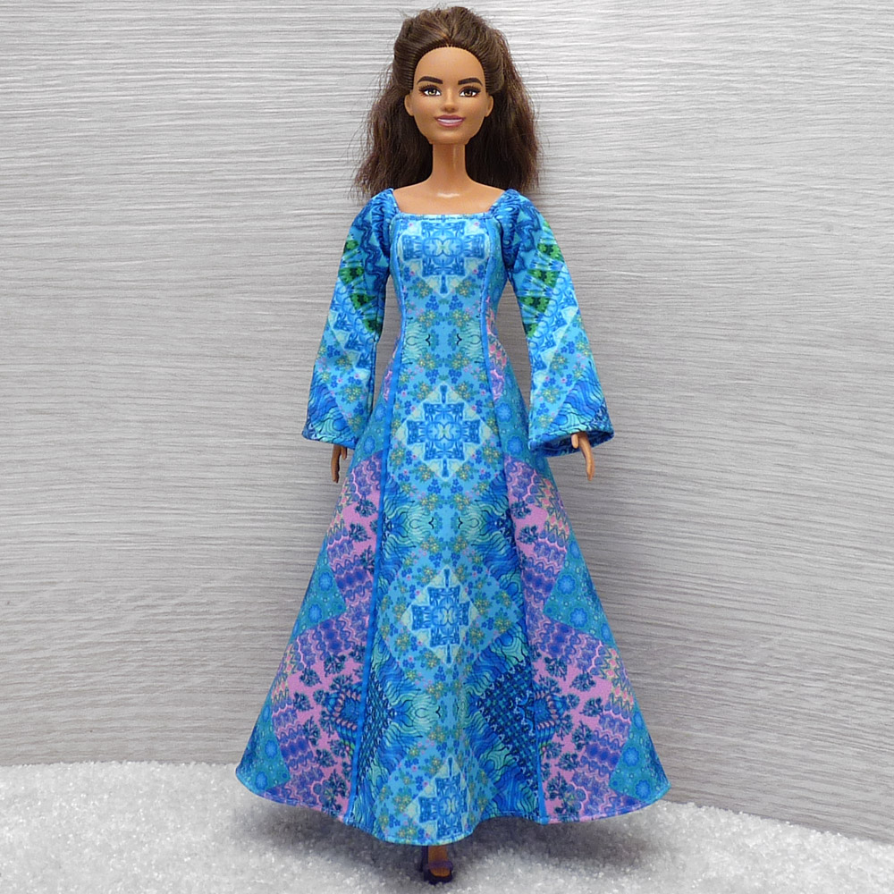 Romantické šaty s ornamentálním vzorem a s rozšířenými rukávy pro Barbie.