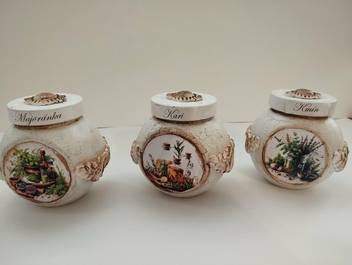 Skleněná doza ma výšku 8 cm x 8 cm . Skleničky jsou zdobeny kuchynským motivem z obou stran a dozdobena filigrány . Z jedné strany názvy koření , které jdou pěkně obměnit