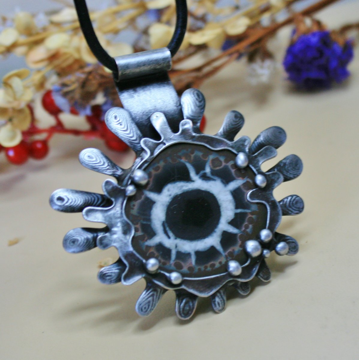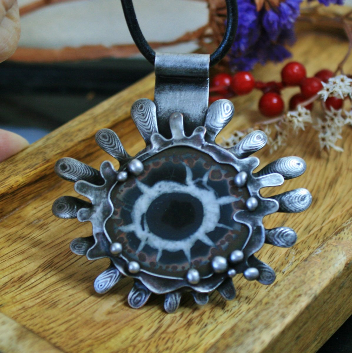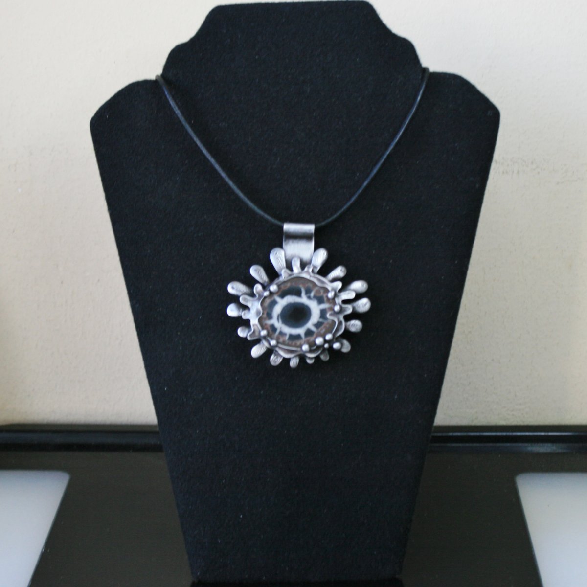 Cínovaný náhrdelník je vytvořen z krásně zbarvené velké septárie. Septárie měří v průměru 4 cm.