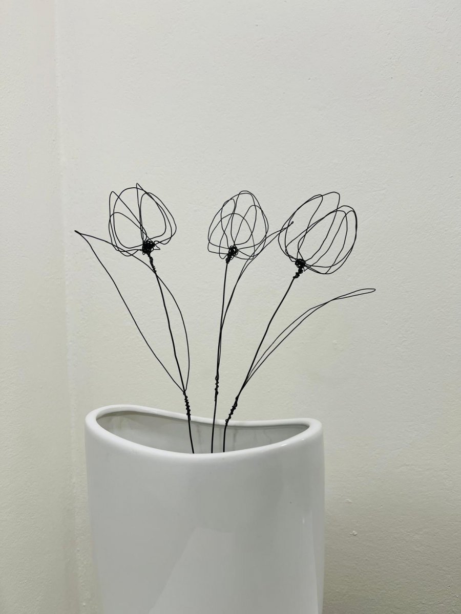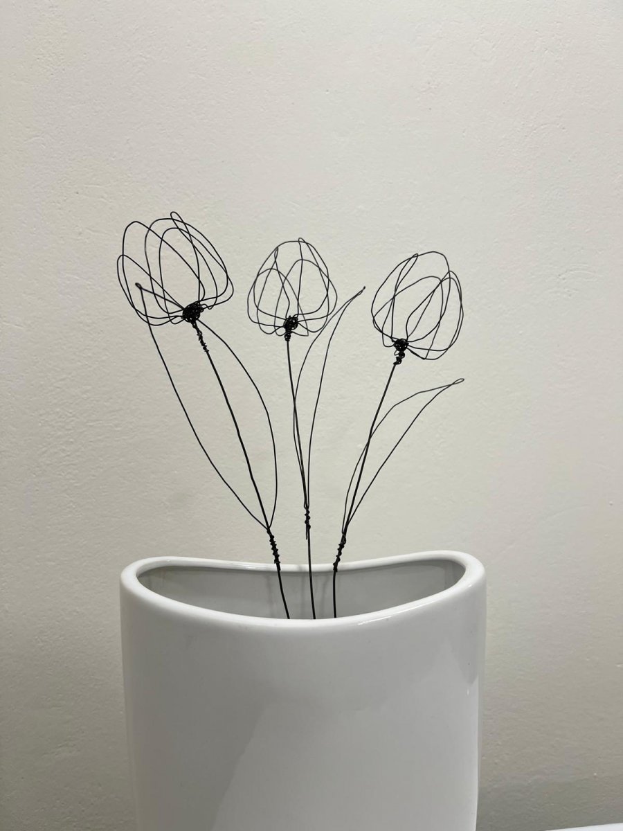 Ručně vyrobené Tulipány z černého (žíhaného) drátku. Vhodné jako dekorace do vázy nebo jako nevšední dárek k narozeninám. Výška cca 40 cm. Výška květu 8 cm, průměr květu 6 cm. Ošetřeno lakem proti korozi.