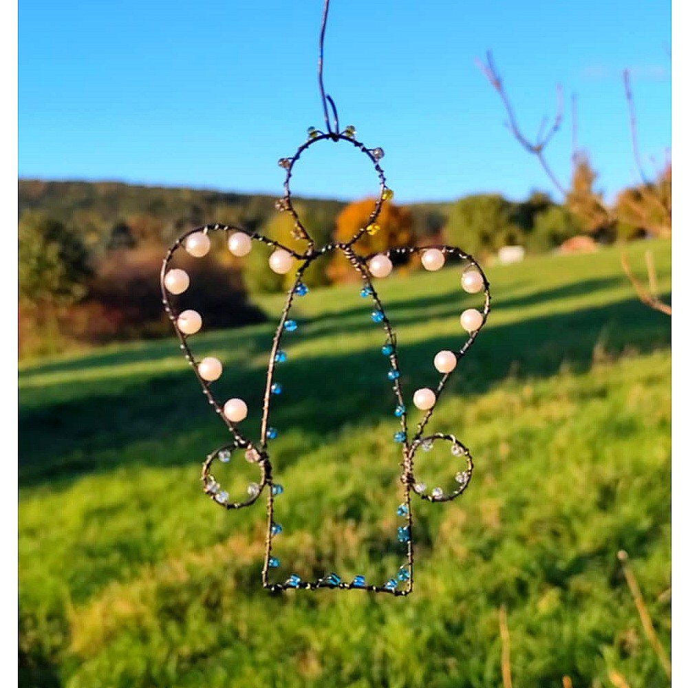 Drátovaný anděl s barevnými korálky, je vyrobený technikou drátování.
