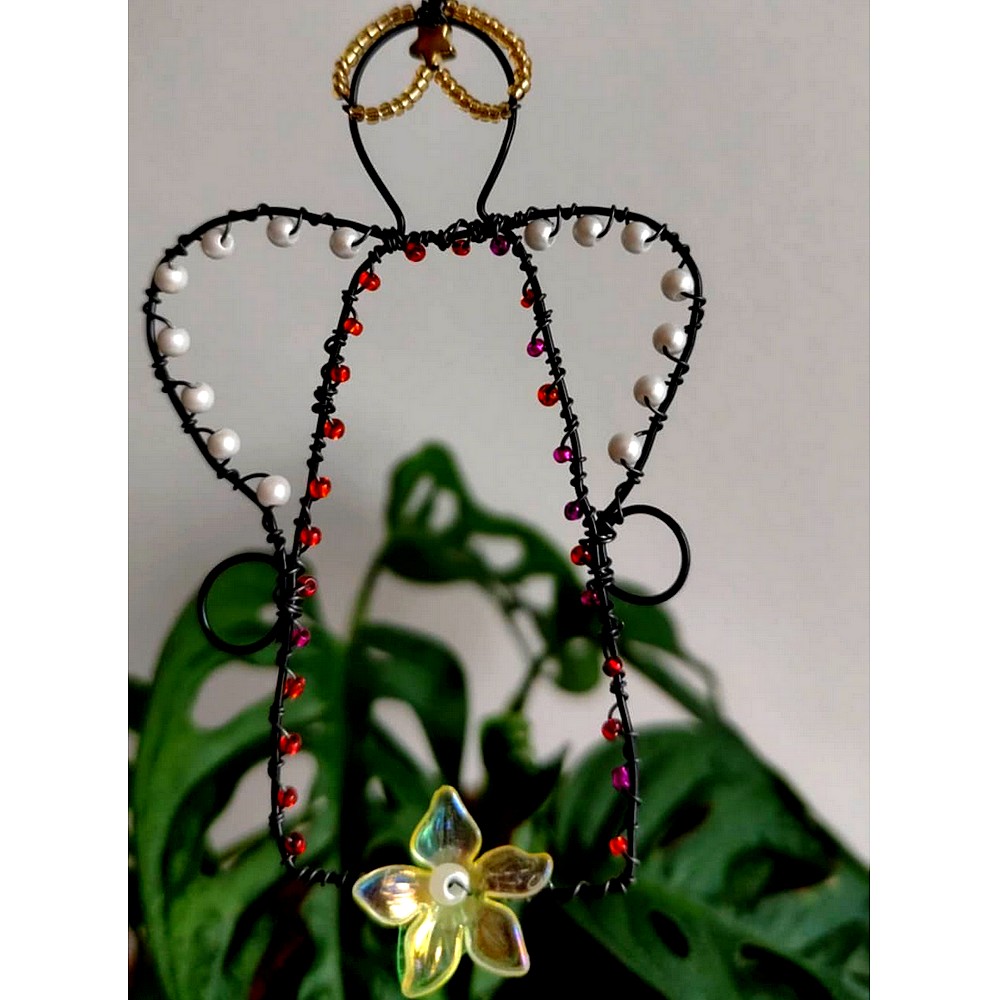 Anděl s barevnými korálky, je vyrobený technikou drátování.