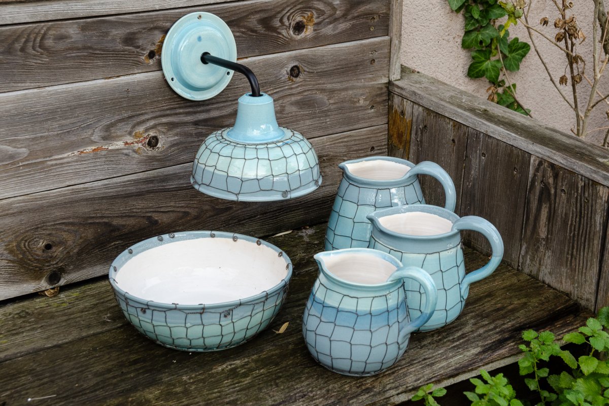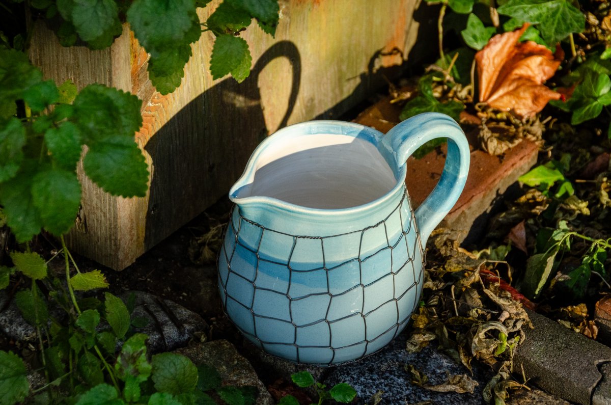 Keramický džbáný točený na kruhu a následně odrátovaný. Glazovaný z vnější i vnitřní strany, odrátovaný hutním, taženým drátem (není nerezový).
