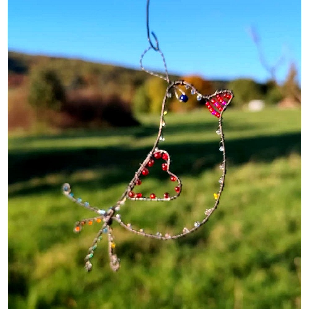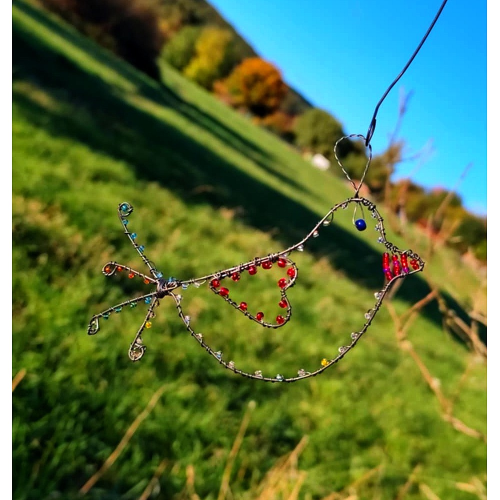Drátovaný ptáček s barevnými korálky, je vyrobený technikou drátování.