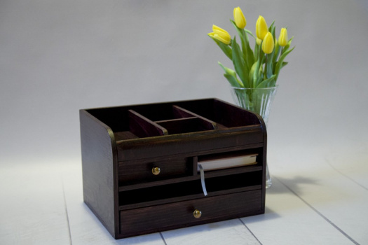 Organizér je vyrobený z tvrdé bukové překližky, mořené do ebenového odstínu. povrch je lakovaný syntetickým lakem který tomuto výrobku dodává pěkně vzhled.