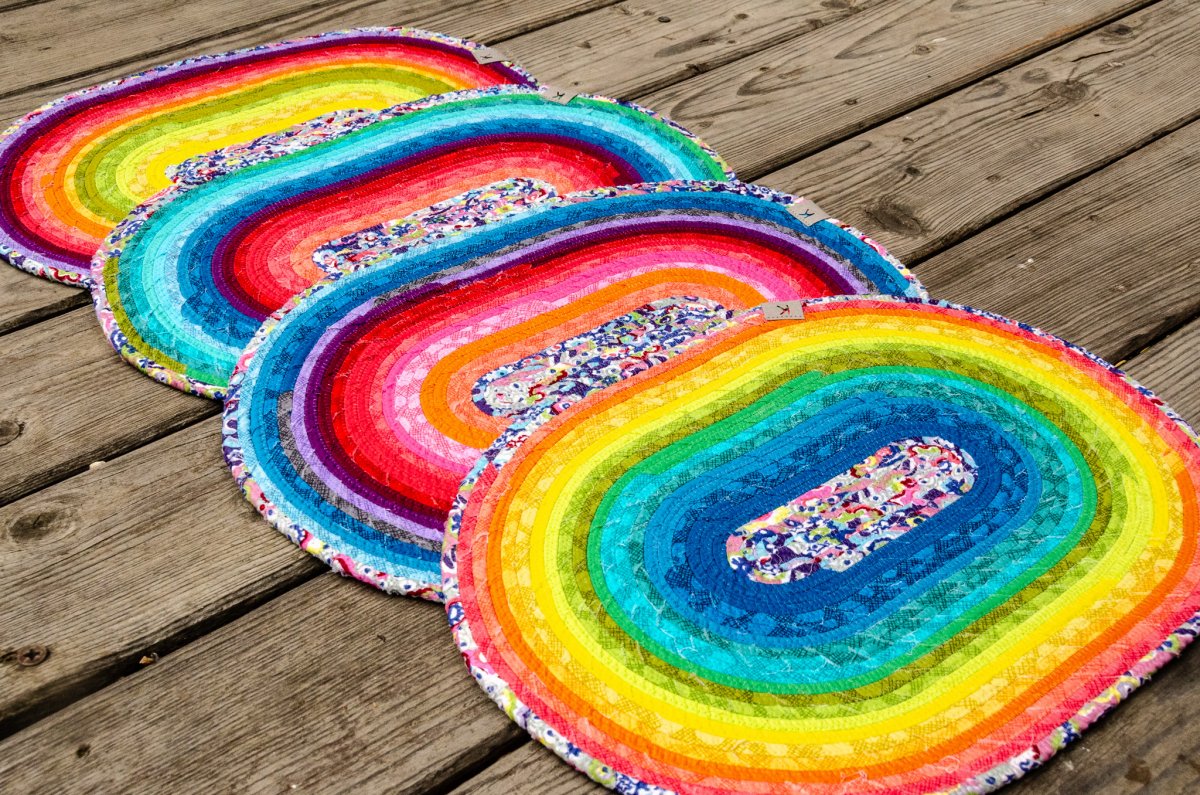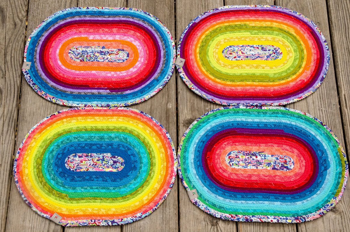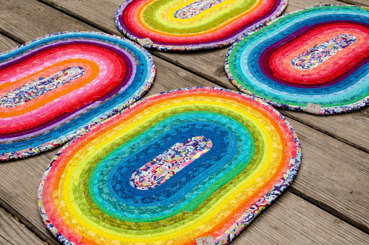 Prostírání ze šňůry je vyrobené sešitím bavlněné šňůry, omotané různobarevnými látkami.