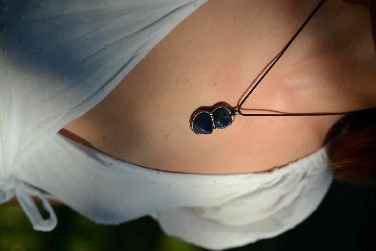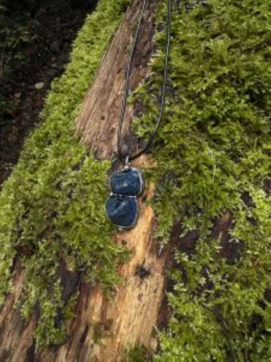 Minerály jsou spojeny bezolovnatým cínem. Patinováno černou patinou a vybroušeno kovovou vatou. Celý šperk ošetřen antioxidačním olejem a naleštěn karnaubským voskem. Šňůřka černá syntetická, délka 45cm.