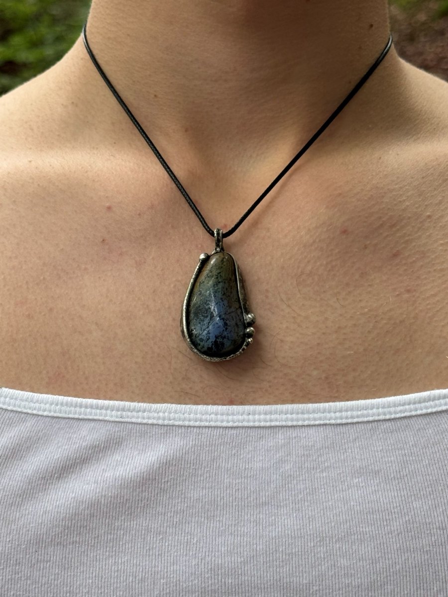 Duhový minerál DUMORTIERIT opracován bezolovnatým cínem. Černá patina, obroušena, takže dává šperku starostříbrný vzhled. Vše ošetřeno antioxidačním olejem a vyleštěno karnaubským voskem.