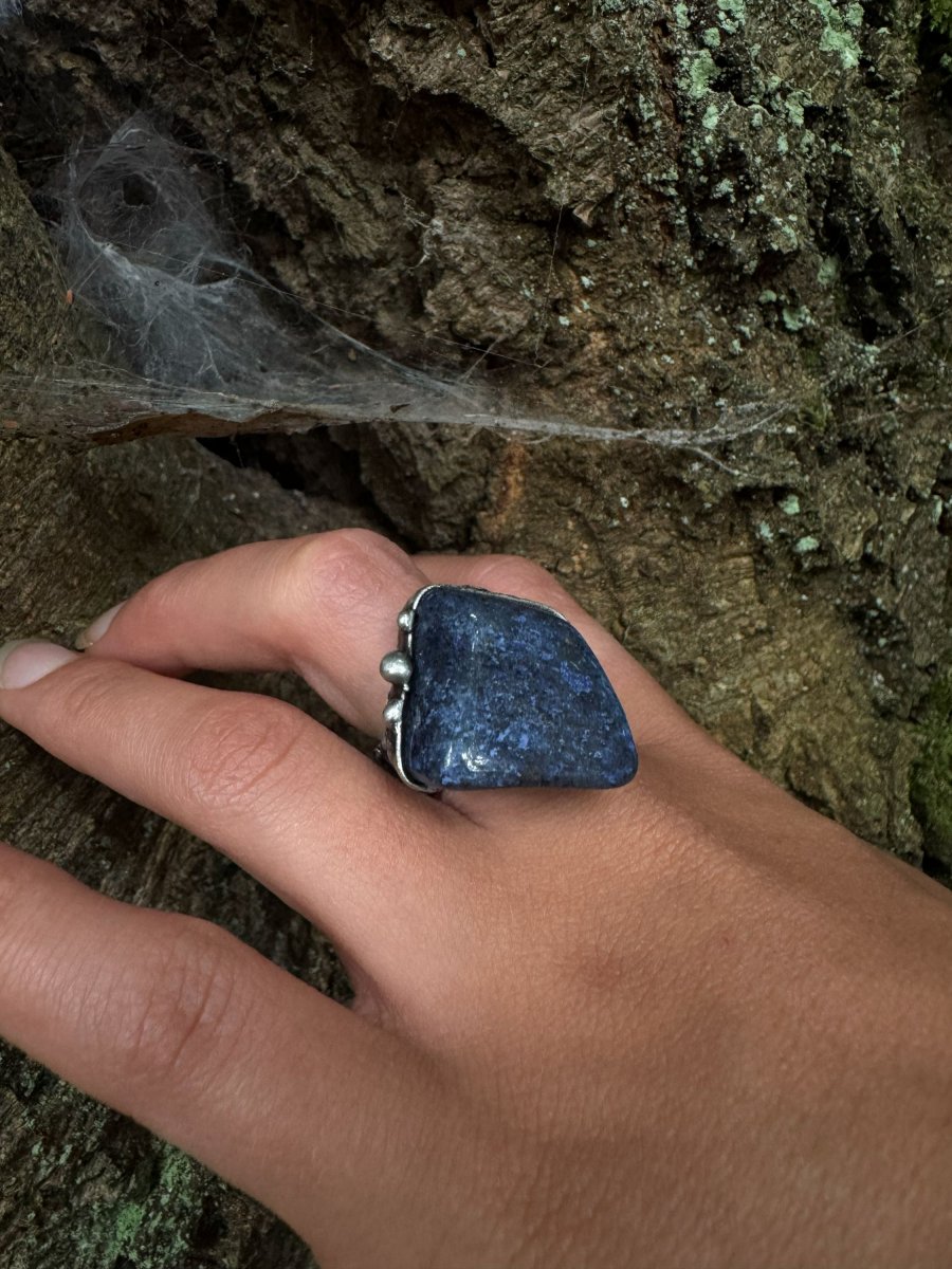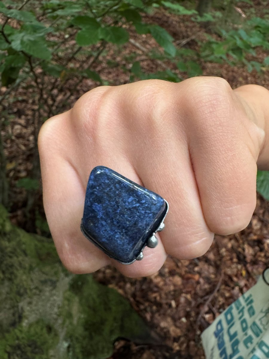 Prstýnek s kamenem DUMORTIERIT. Tmavě modrá barva s černými detaily.